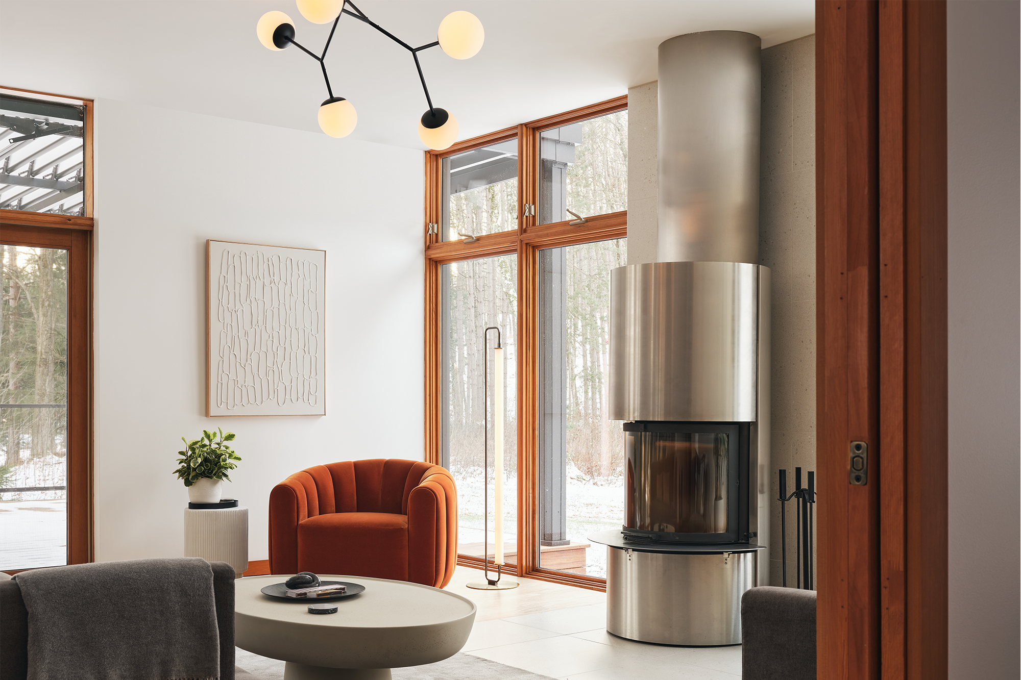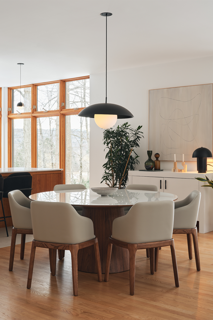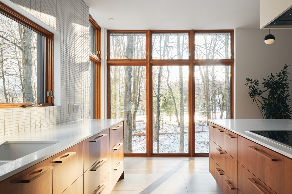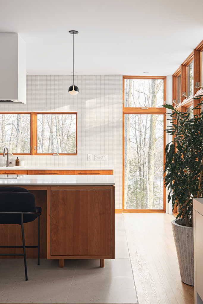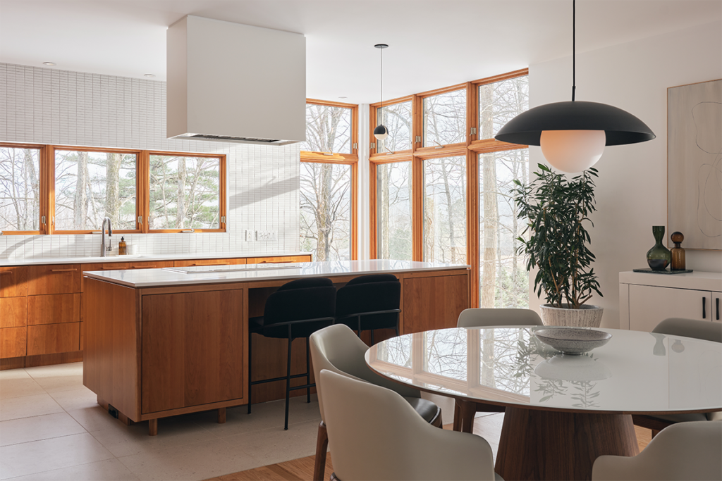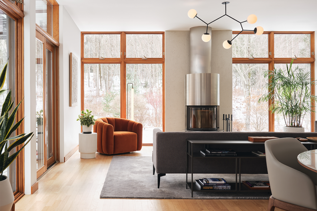 En busca de un hogar en Eastern Townships, en Sutton, Canadá, los clientes de esta casa quedaron cautivados por esta amplia residencia inspirada en mediados de siglo, con sus líneas limpias, volúmenes simples y ventanas de madera del piso al techo. Por ello, decidieron contratar a la firma La Nony FAMILI para renovar el interior.