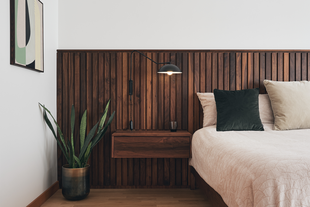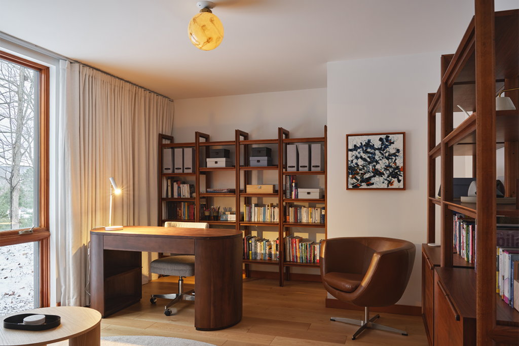 Para los muebles personalizados de los espacios habitables se eligió el cerezo americano, una especie de madera de origen local que rara vez se utiliza. Su icónico tono marrón rojizo calienta y energiza estas áreas, mientras que el nogal fue preferido en espacios más íntimos por su elegancia y profundidad, añadiendo un toque extra de refinamiento.