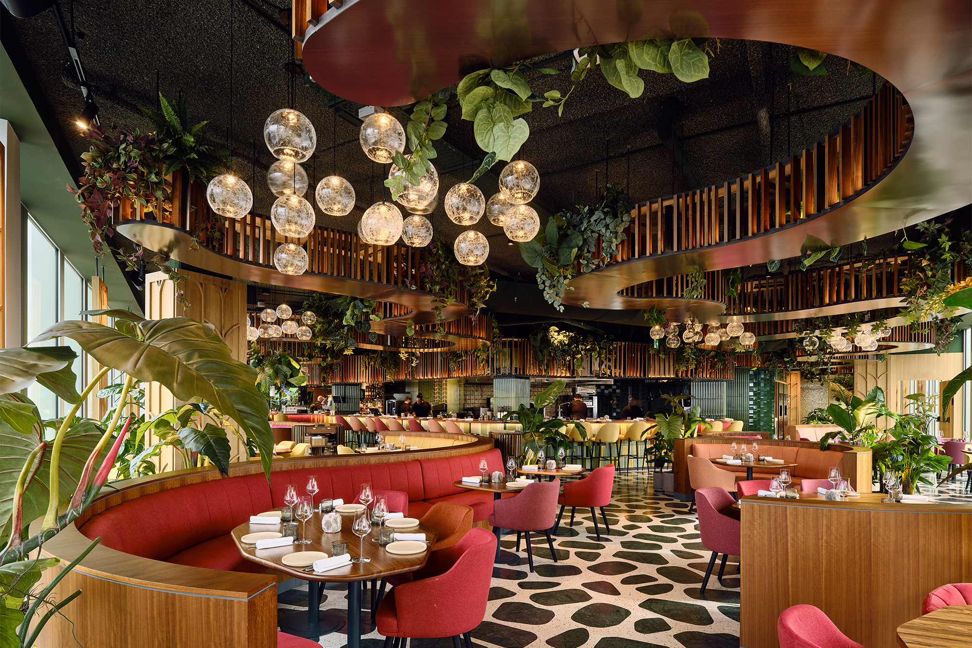 Los colores vibrantes, inspirados en frutas tropicales y aves, aportan energía a través de los muebles y el frente ondulado del bar, cubierto de azulejos coloridos que recuerdan a los textiles latinoamericanos. El gran bar se extiende por todo el espacio, energizando la sala con su actividad animada, área de bebidas y cocina abierta.