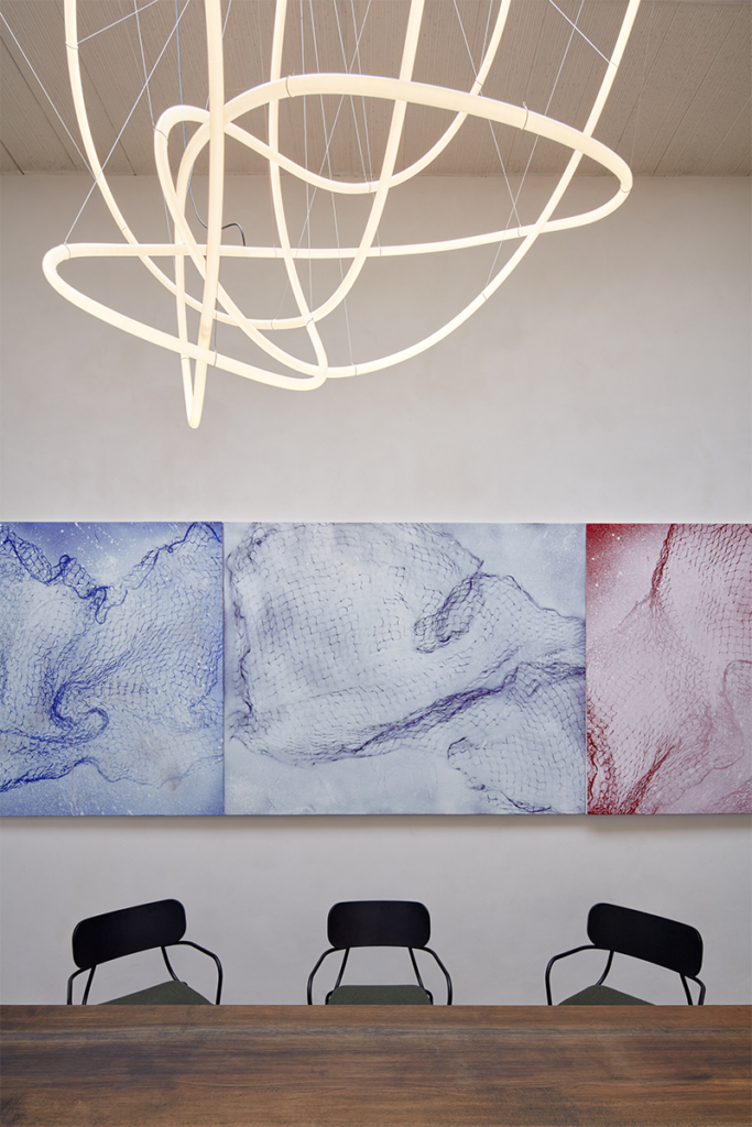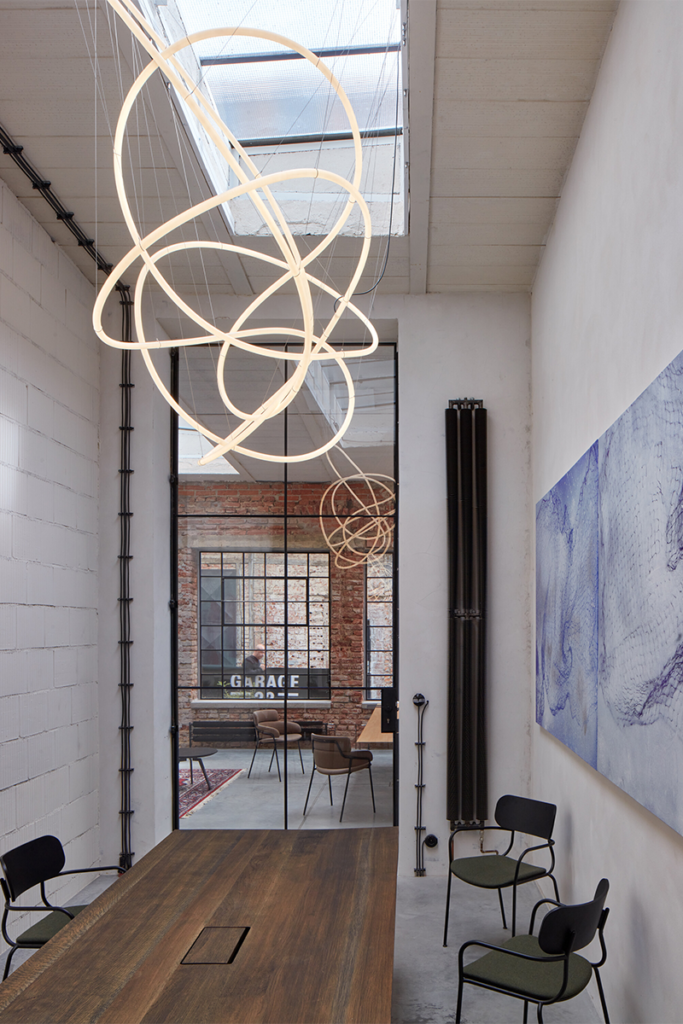 Este ‘Foyer-Showroom’, diseñado por la firma Mar.s Architects, enfatiza la selección de productos del portafolio de Marslab. La joya de este espacio es una luminaria de Jiří Krejčiřík, suspendida sobre una mesa de Viccarbe rodeada de cómodas sillas del veterano fabricante italiano Arrmet.