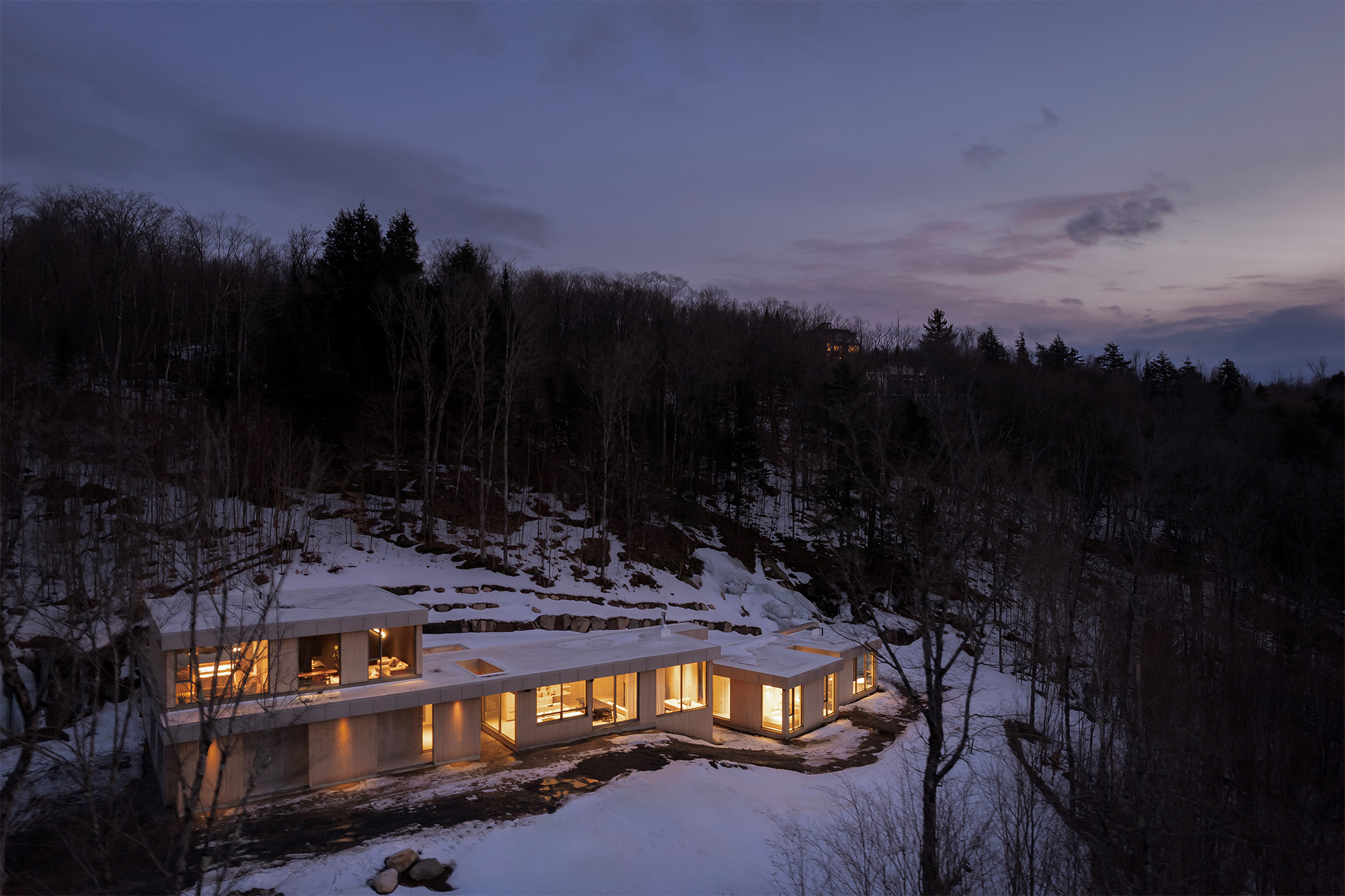 Los materiales locales y sostenibles utilizados en la construcción, como el cedro natural, crean una estética elegante, respetando al mismo tiempo el medio ambiente. El aluminio anodizado se desarrolló en una cromática específica, extrayendo su esencia de los tonos de escarcha de las hojas de arce que se encuentran en el sitio.