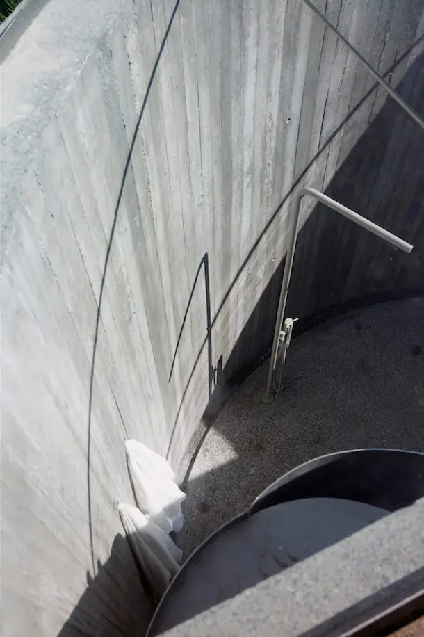 La primera vivienda, de 87 metros cuadrados, se emplaza en la parte baja de la pendiente y la definen como un cuerpo alargado. Sobre uno de sus extremos, una escalera entre muros permite subir a la cubierta, que se ofrece como una terraza que domina visualmente la geografía. En el lado opuesto, un patio curvo contiene una ducha bajo el cielo. Aquí la arquitectura se adapta a la topografía pero, al tiempo, la reconfigura. Propone una vida en dos niveles y en contacto con la montaña, e introduce la luz del sol al espacio íntimo.