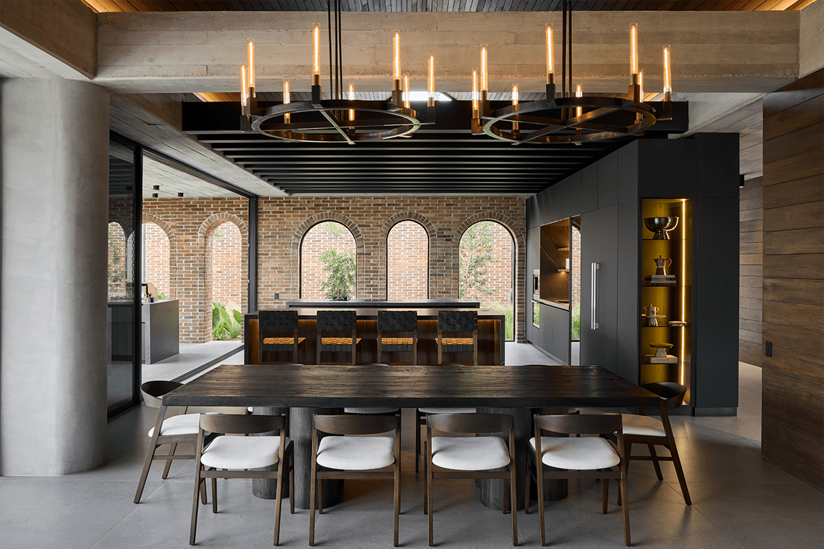 A pesar de sus dimensiones, la interiorista logra que esta cocina se sienta como un sitio acogedor mediante el uso de distintos materiales y el juego con la luz artificial, todo esto sin descuidar su propósito utilitario: conectarla con el comedor principal y el área de BBQ y piscina.