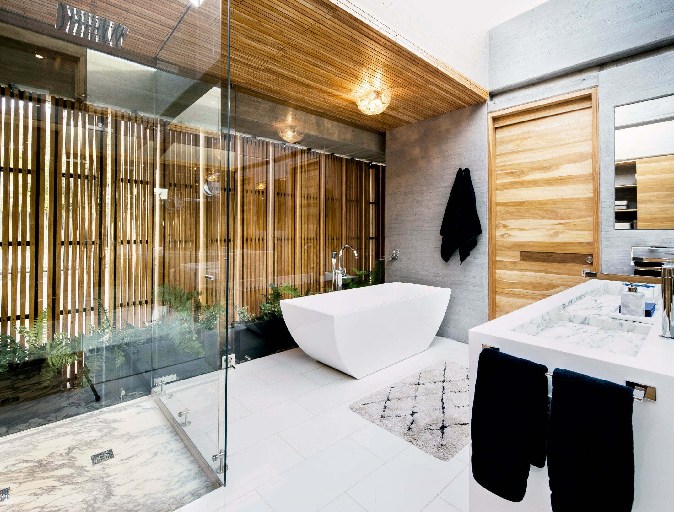 Respecto a los materiales, las tinas de mármol, cerámica o acrílico son de un look minimalista y elegante, mientras las de hierro esmaltado blanco con patas metálicas, evocan las clásicas tinas. En cuanto a las duchas, vienen en todos los tamaños y formatos (rectangular, cuadrado y circular). Las de acero mezcladas con paredes de cemento pulido son de una estética más industrial, mientras que el porcelanato y la cerámica pueden adaptarse a variedad de conceptos.