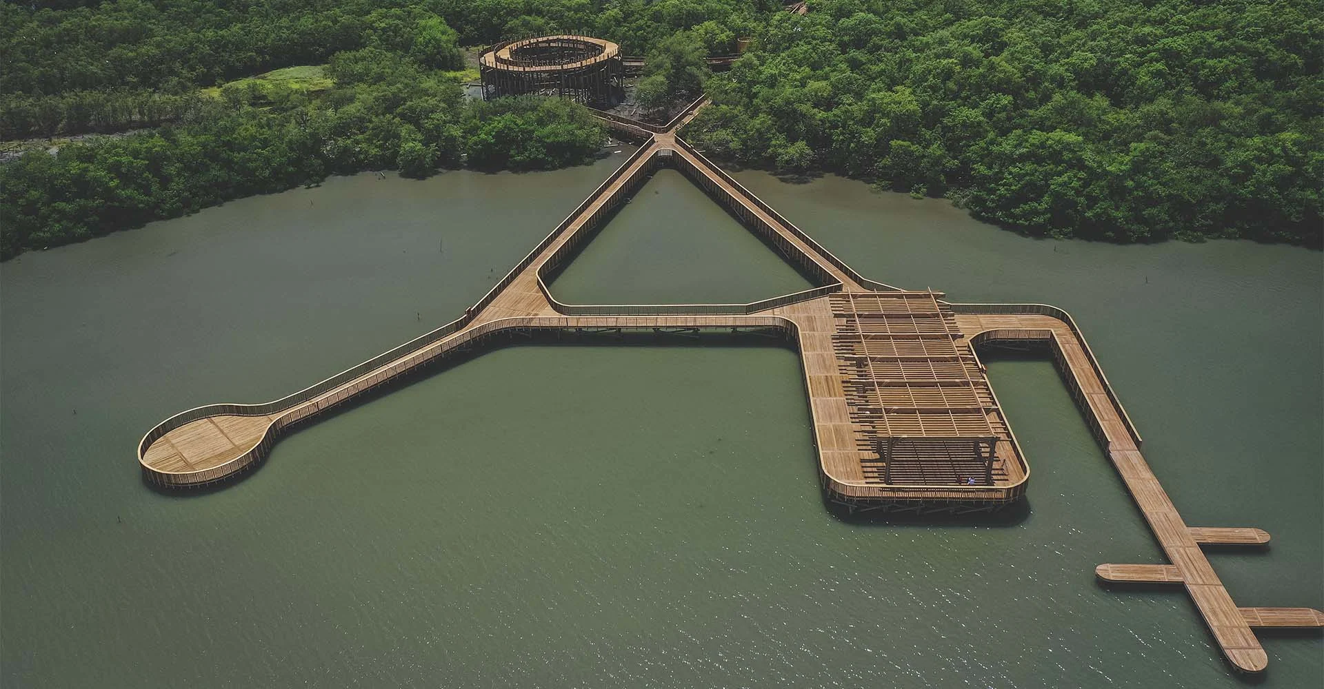 Su arquitectura se comporta como una pasarela que surca las áreas boscosas y los manglares hasta flotar sobre el agua. Su condición lineal le permite hacer variaciones que generan un circuito entre muelles, puentes, bifurcaciones y bucles que se levantan para definir recintos abiertos, a duras penas delimitados y que no alcanzan a ser propiamente edificios.
