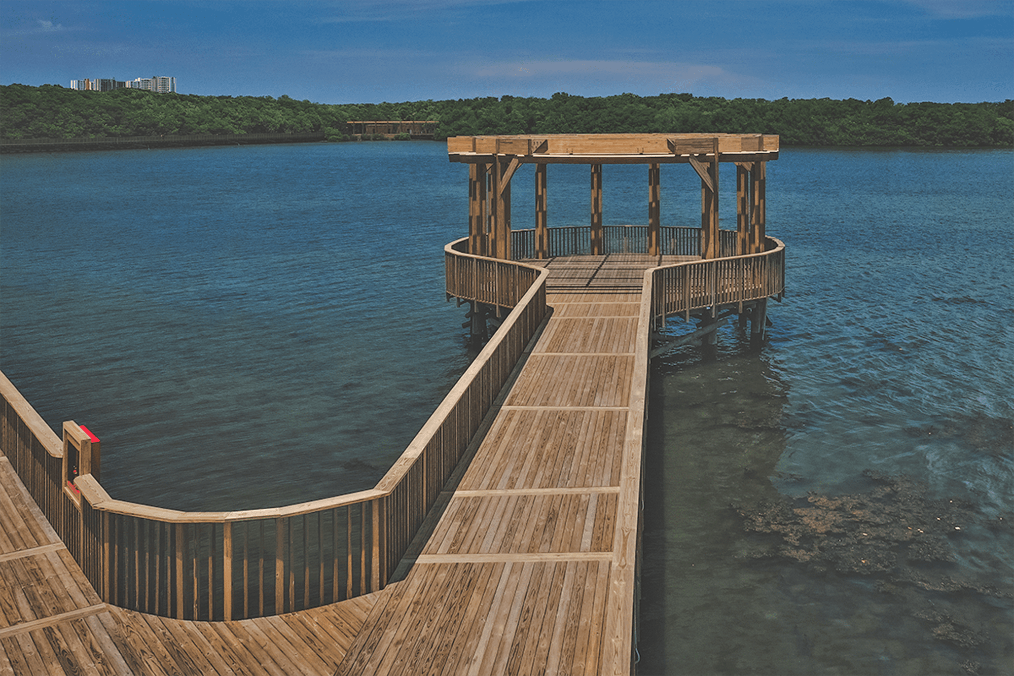 La arquitectura del proyecto aparece como una pasarela que recorre las áreas boscosas y de manglares hasta flotar sobre el agua. Su condición lineal le permite hacer variaciones que generan un circuito entre muelles, puentes, bifurcaciones y bucles que se levantan para definir recintos abiertos, a duras penas delimitados y que no alcanzan a ser propiamente edificios.
