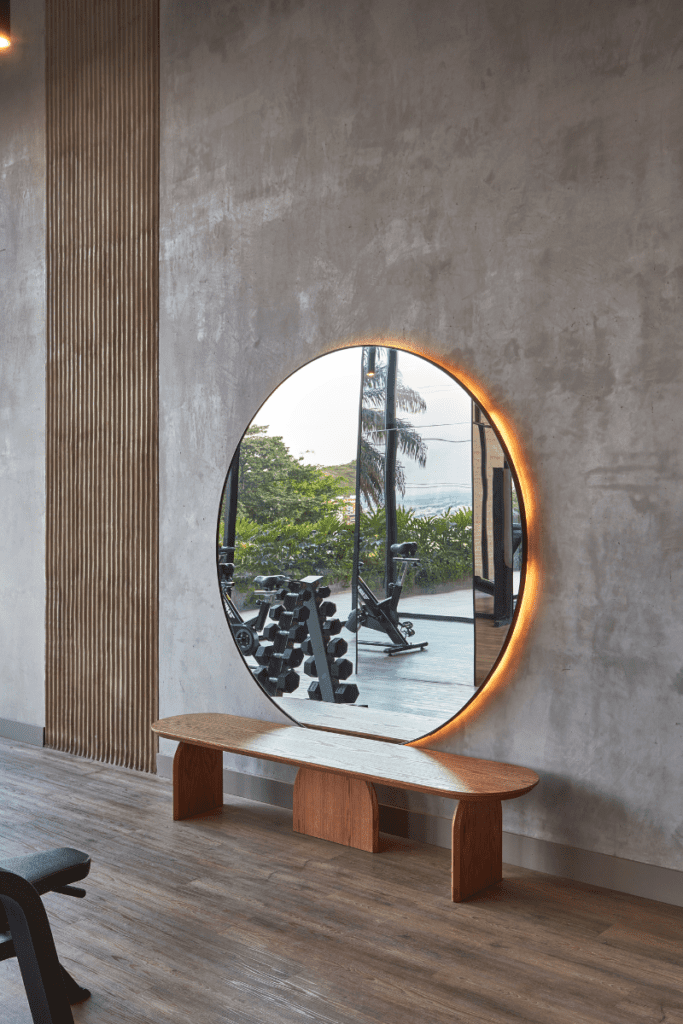Junto con la luz, los espejos se encuentran en todo el proyecto: ahumados, palo de rosa, bronce y formas geométricas diversas como elementos decorativos, usados, además, como estrategia para darles profundidad a los espacios o traer el exterior al interior. Espejo sobre espejo, en complicidad con la iluminación, crean atmósferas sorprendentes, refinadas y casi surrealistas.