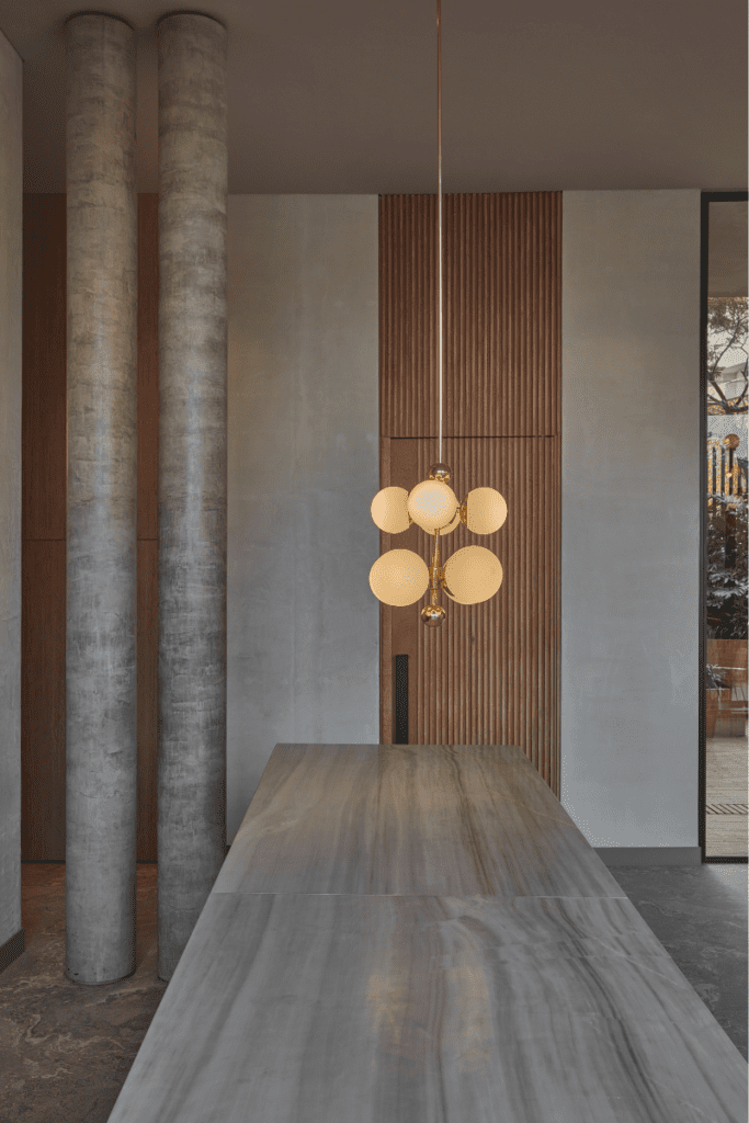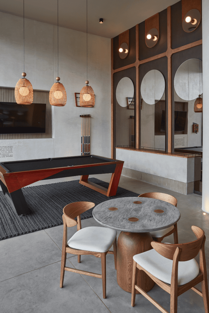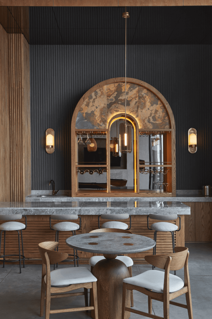 Reconocidos por el diseño de su mobiliario –que ellos mismos fabrican–, en el salón llamado La Tertulia destaca una imponente mesa de billar que combina con materiales como cemento, bronce, madera y el área del bar. Este último es una pieza única: contra la pared de cemento estriado gris se alza un arco con tímpano en alabastro, flanqueado por superficies de espejo que replican el fondo y la lámpara al frente. La madera del mobiliario y las tapas de mármol travertino gris completan el look de este lugar que juega con lo surrealista.