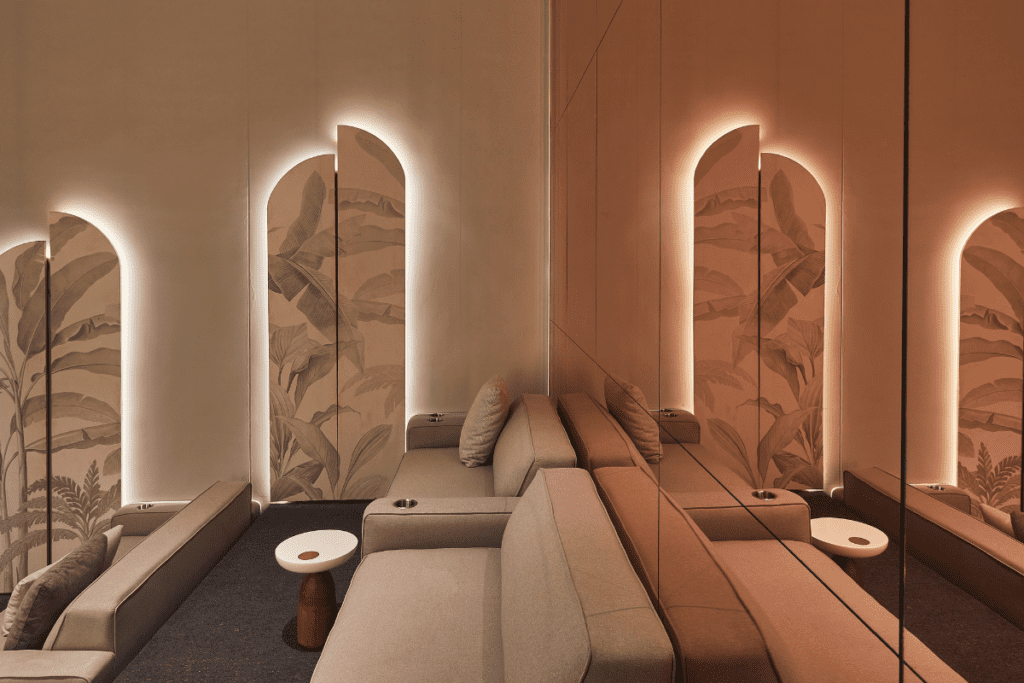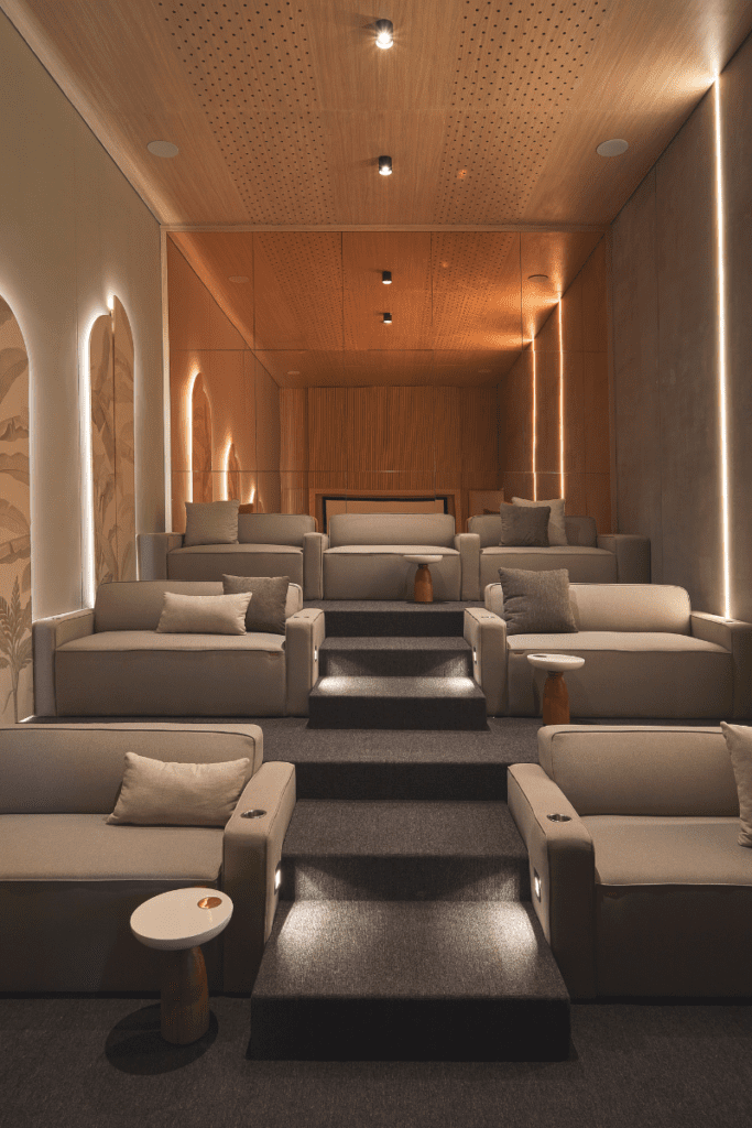 La altura de casi cinco metros los llevó a escalonar la sala que, junto con el espejo palo de rosa de fondo, refleja el área. Los paneles laterales tapizados con palmeras, destacados por luz led, enmarcan las hileras de sofás iluminadas desde el piso.
