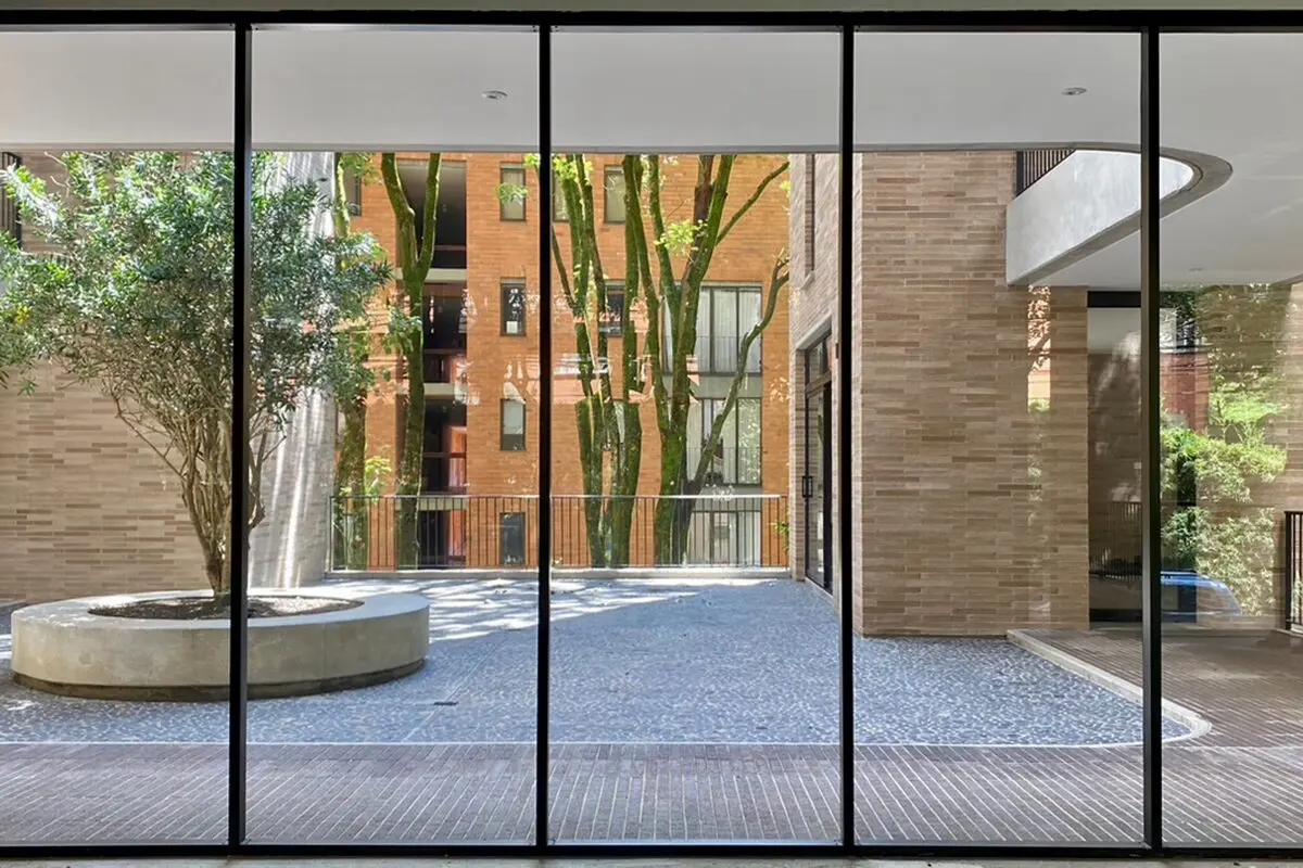 El proyecto da frente a dos esquinas. “Esta condición tipológica nos remitió a uno de los primeros edificios de vivienda moderna construidos en el occidente de Medellín a mediados del siglo pasado, el edificio Laureles, diseñado por Guillermo Atehortúa (1959), con un acceso peatonal escalonado que conecta directamente la calle y un patio central. Esto con el propósito de generar una sucesión de espacios intermedios que le otorgan un carácter más doméstico al recorrido”.