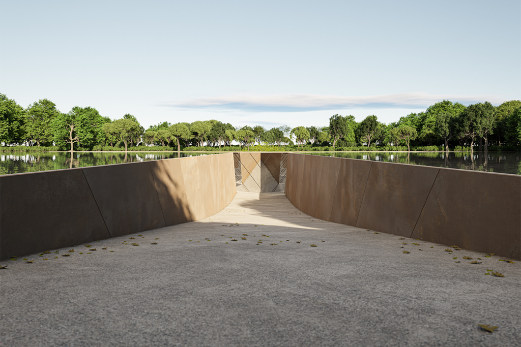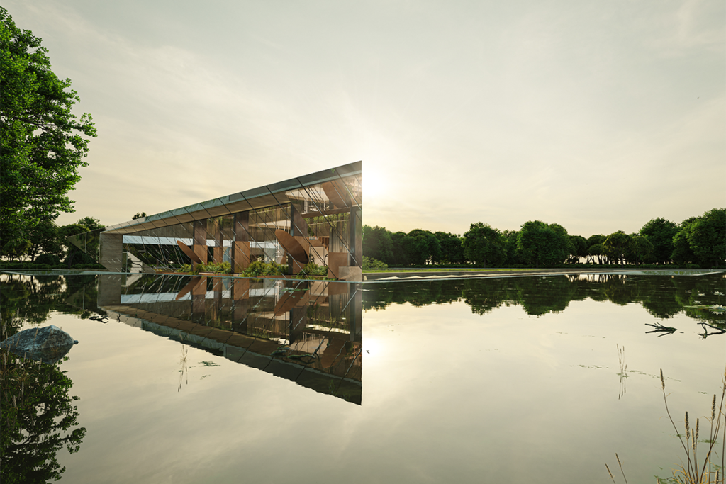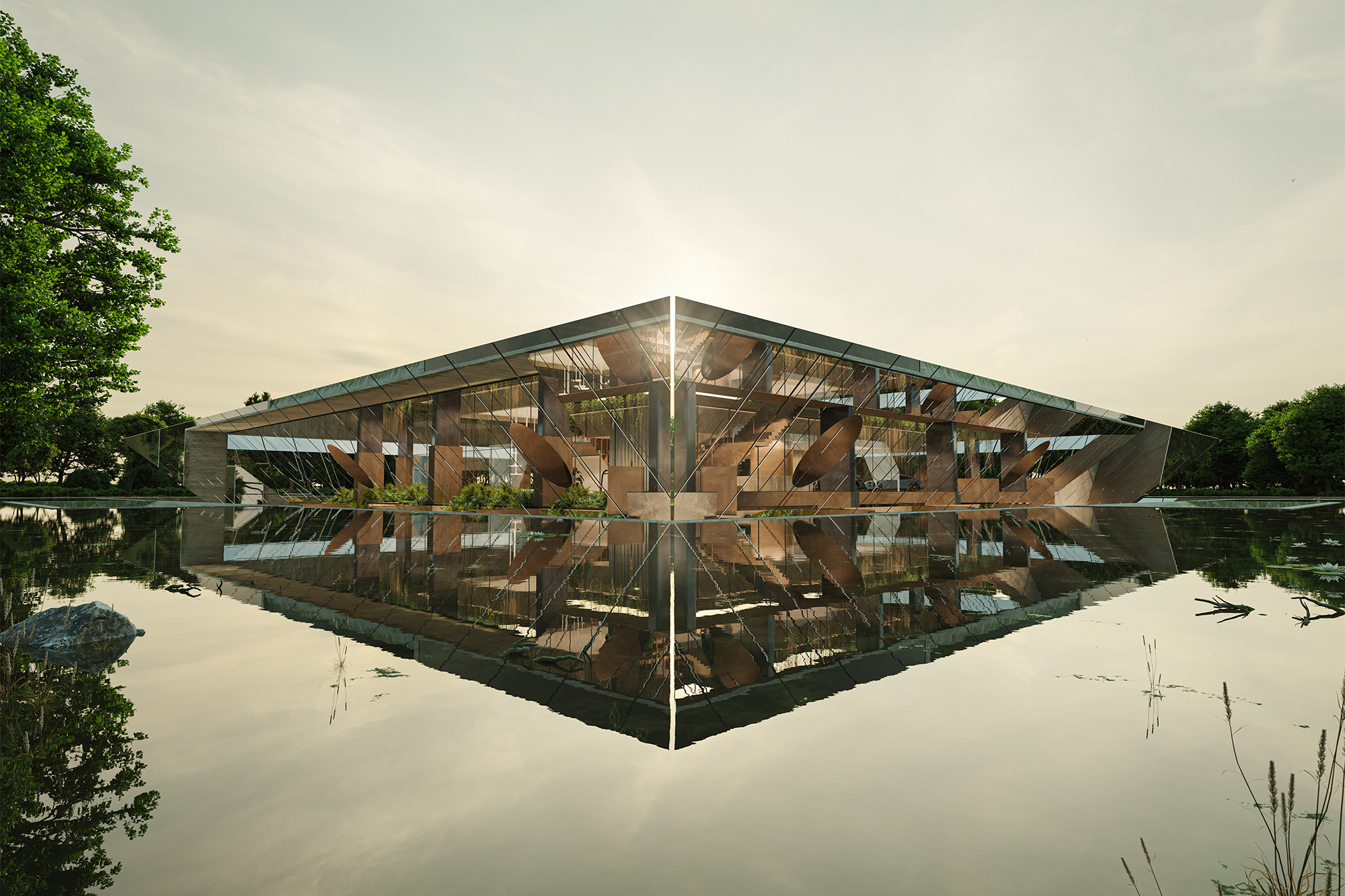 El edificio tiene dos niveles subterráneos y, según el uso del espacio en un momento determinado, los espejos se pueden colocar al nivel donde se requiere luz y vista. Por la noche, cuando ya no se necesita luz y vista del paisaje, las estructuras de espejos descienden para desaparecer nuevamente en el paisaje.