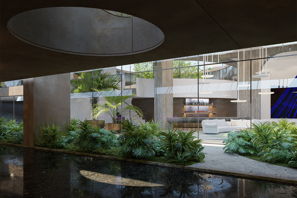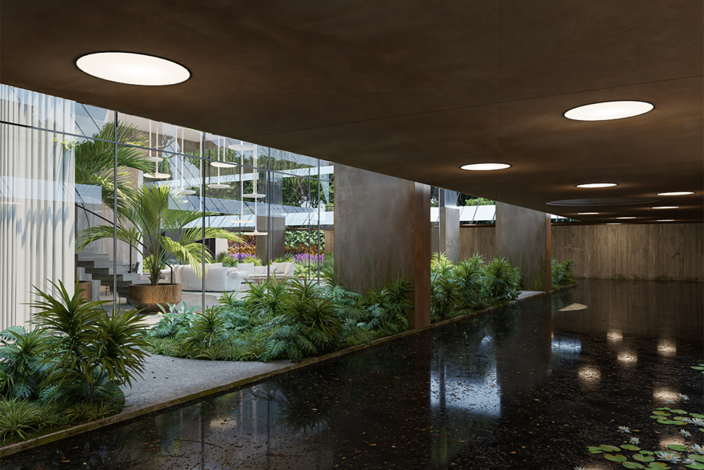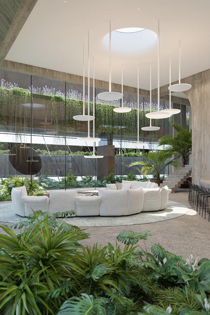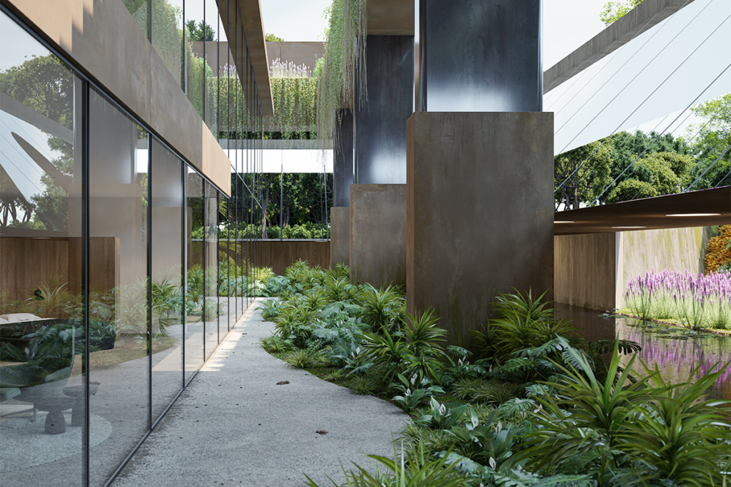 La movilidad de las partes espejadas que rodean el edificio cumple otro propósito de sostenibilidad. La construcción superior del espejo sirve como contenedor para colgar plantas y arbustos, ofreciendo un verde exuberante en las profundidades del edificio.