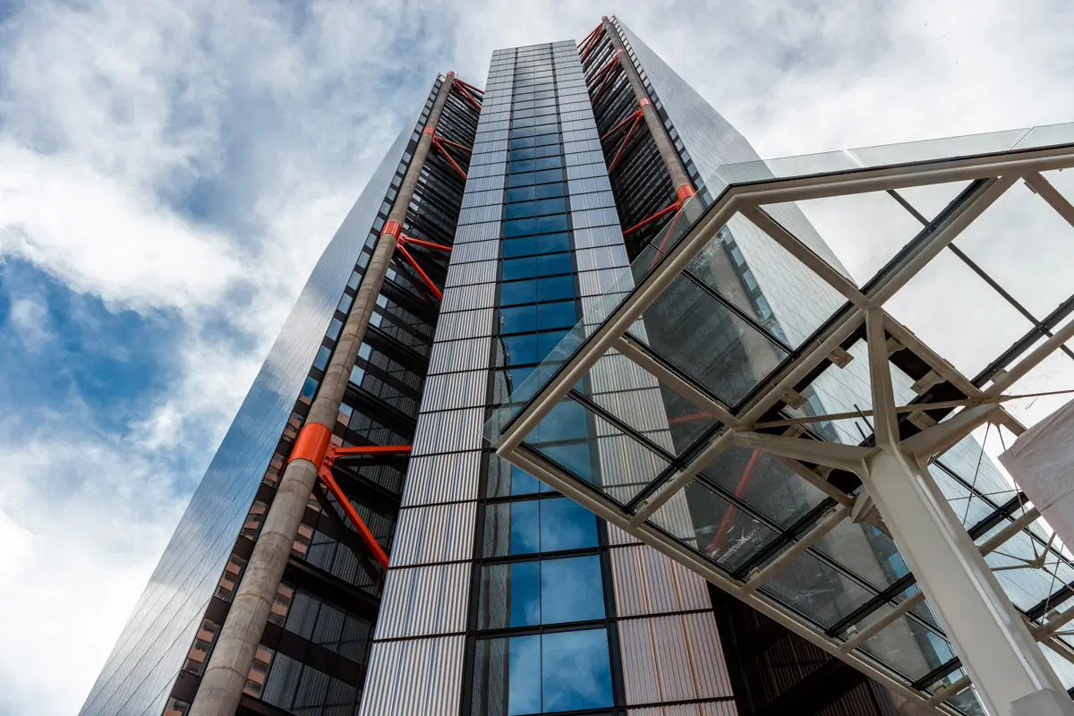 Las diagonales, según su ubicación y función dentro de la estructura, varían en longitudes y en diámetro, para convertirse cada una en un elemento singular. Sus encuentros con el concreto y sus interacciones con la fachada se realizan a partir de piezas únicas, que hacen del diseño y el desarrollo de los detalles constructivos del edificio una labor titánica y extraordinaria. La piel de vidrio, creada a la medida en conjunto con Permasteelisa –empresa global líder en ingeniería, gestión de proyectos, fabricación e instalación de envolventes arquitectónicas y de sistemas de interiores–, complementa la estructura y ofrece las prestaciones requeridas para garantizar un adecuado confort térmico y acceso a iluminación natural al interior de todos los espacios.