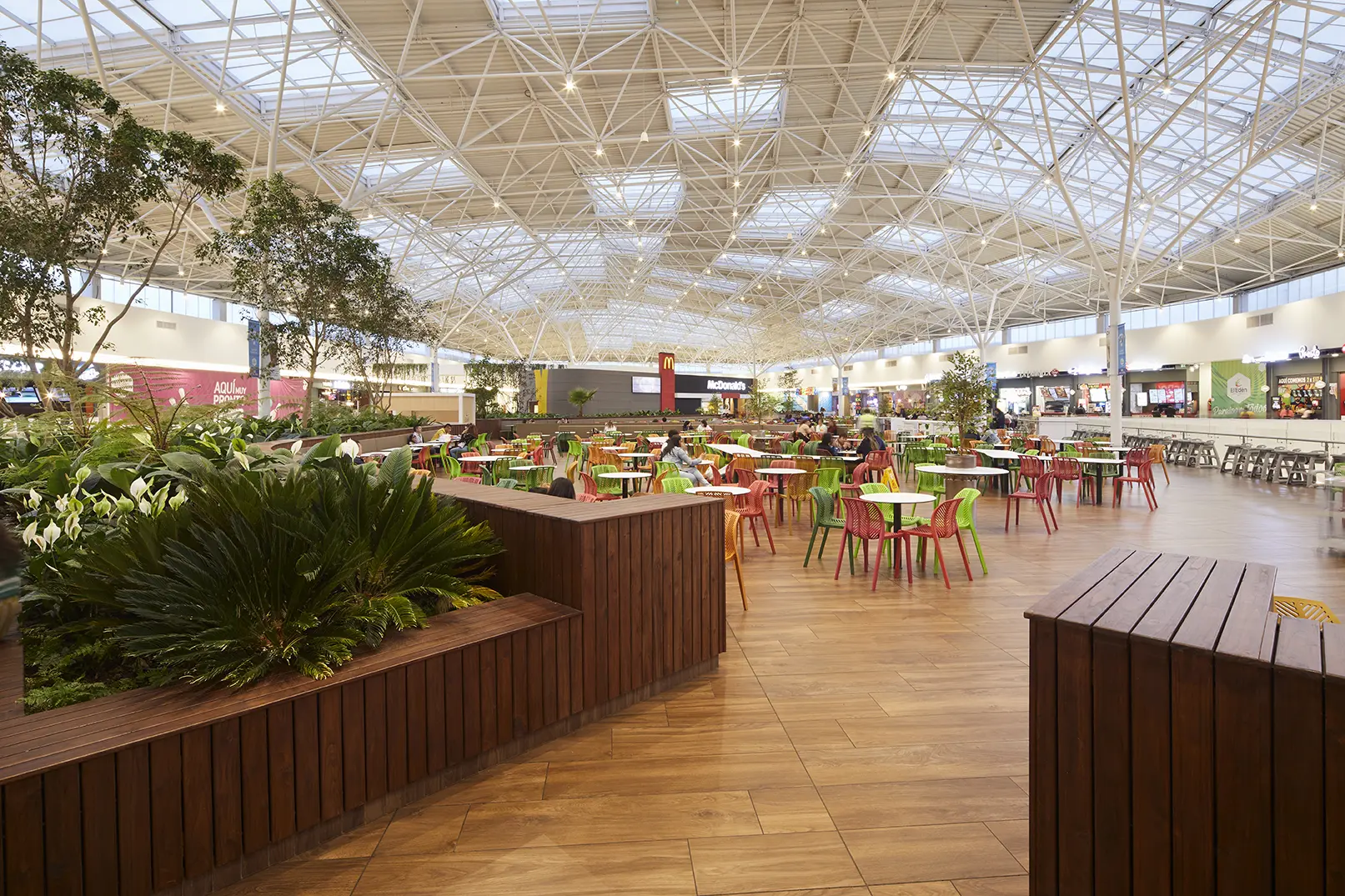 Con el fin de buscar que nuevos diseños que además de brindar entretenimiento sean sostenibles, la propuesta integró conceptos para maximizar la experiencia de confort del visitante al evocar patrones y colores propios de la naturaleza de los que carece el sector. “La plazoleta de comidas está ideada para generar la sensación de un jardín, por eso le integramos vegetación abundante y una estructura con columnas que evoca árboles gigantes que están acompañados de luz natural haciendo que el estar allí sea una experiencia inigualable.”