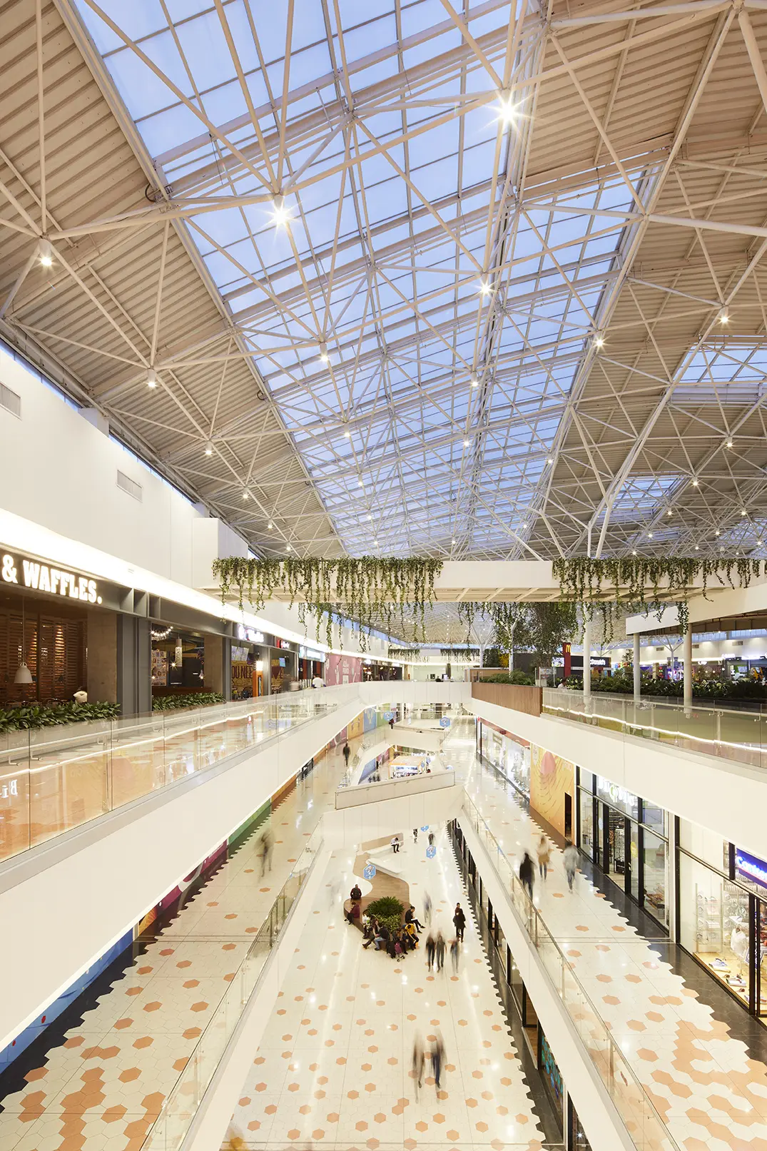 El diseño biofílico también se percibe a gran escala en el interior. Tiene una conexión con la naturaleza en cada uno de los espacios como corredores, escaleras, zona de comidas o espacios entre tiendas, potencializando la sensación de confort, calidez y bienestar gracias a la adecuación y colores usados para la construcción.