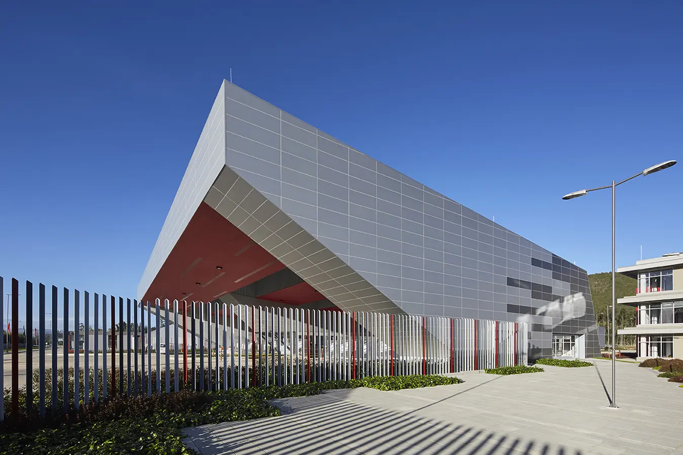 A través de su diseño de líneas contundentes y sencillas, el desarrollo busca transmitir una imagen dinámica y productiva, moderna e innovadora, expresando solidez y confianza para sus usuarios. El edificio que alberga el pórtico de acceso es el ejemplo más singular de esta intención corporativa. Su generoso tamaño ofrece una entrada imponente y otorga jerarquía al complejo, aunque la geometría facetada y su impresionante vuelo le dan a la vez un aire liviano y etéreo.