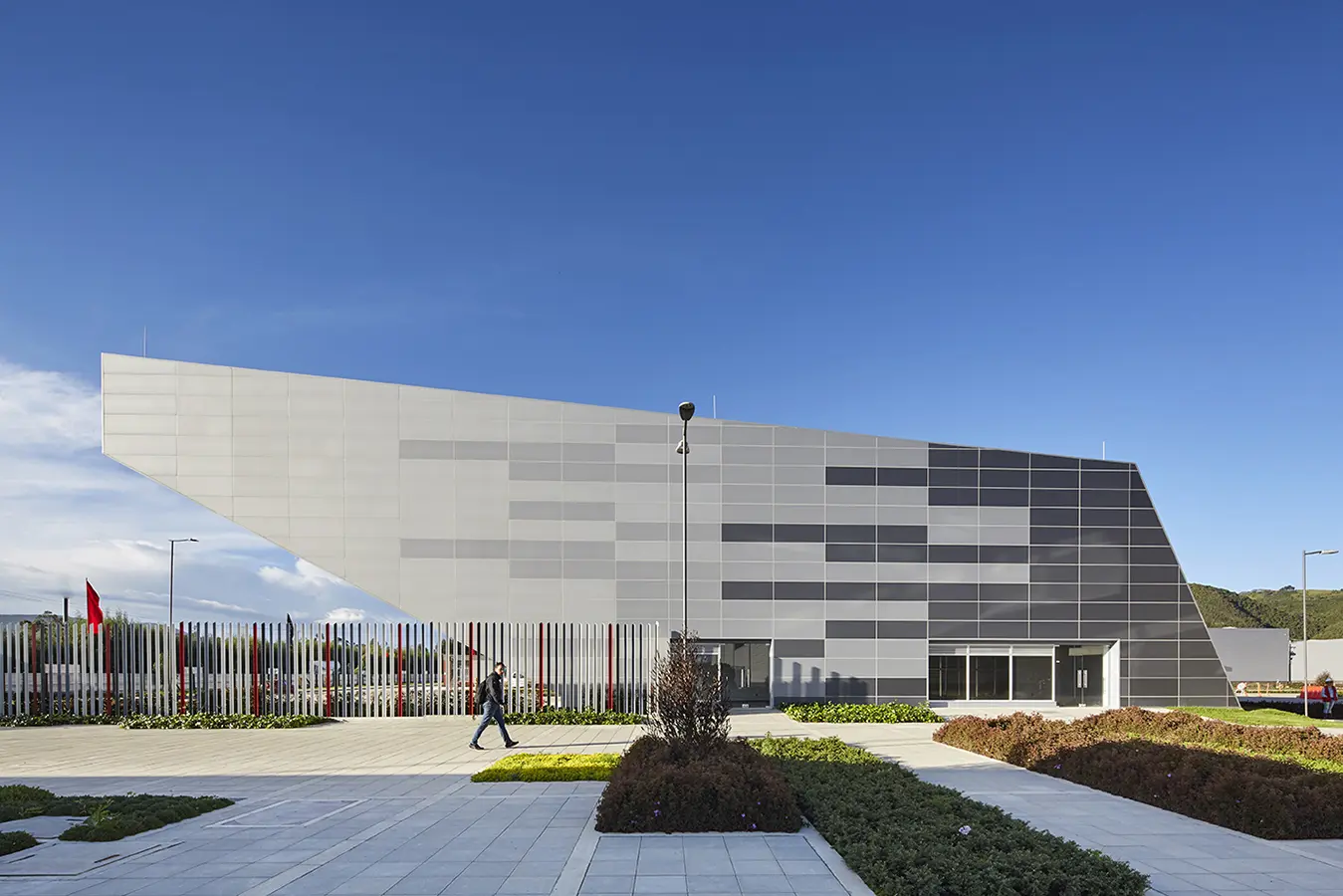 Para lograr este tipo de contrastes en su arquitectura, y generar esta imagen contemporánea y atrevida, la empresa decidió utilizar el sistema Tile, de Hunter Douglas, al recubrir el volumen. Siendo un material ligero y modular, el revestimiento permite generar la apariencia contundente y masiva sin añadir gran peso sobre la estructura. De esta manera, un elemento que a simple vista aparece sólido y pesado, se construye a partir de piezas ligeras que pueden flotar sobre grandes distancias.