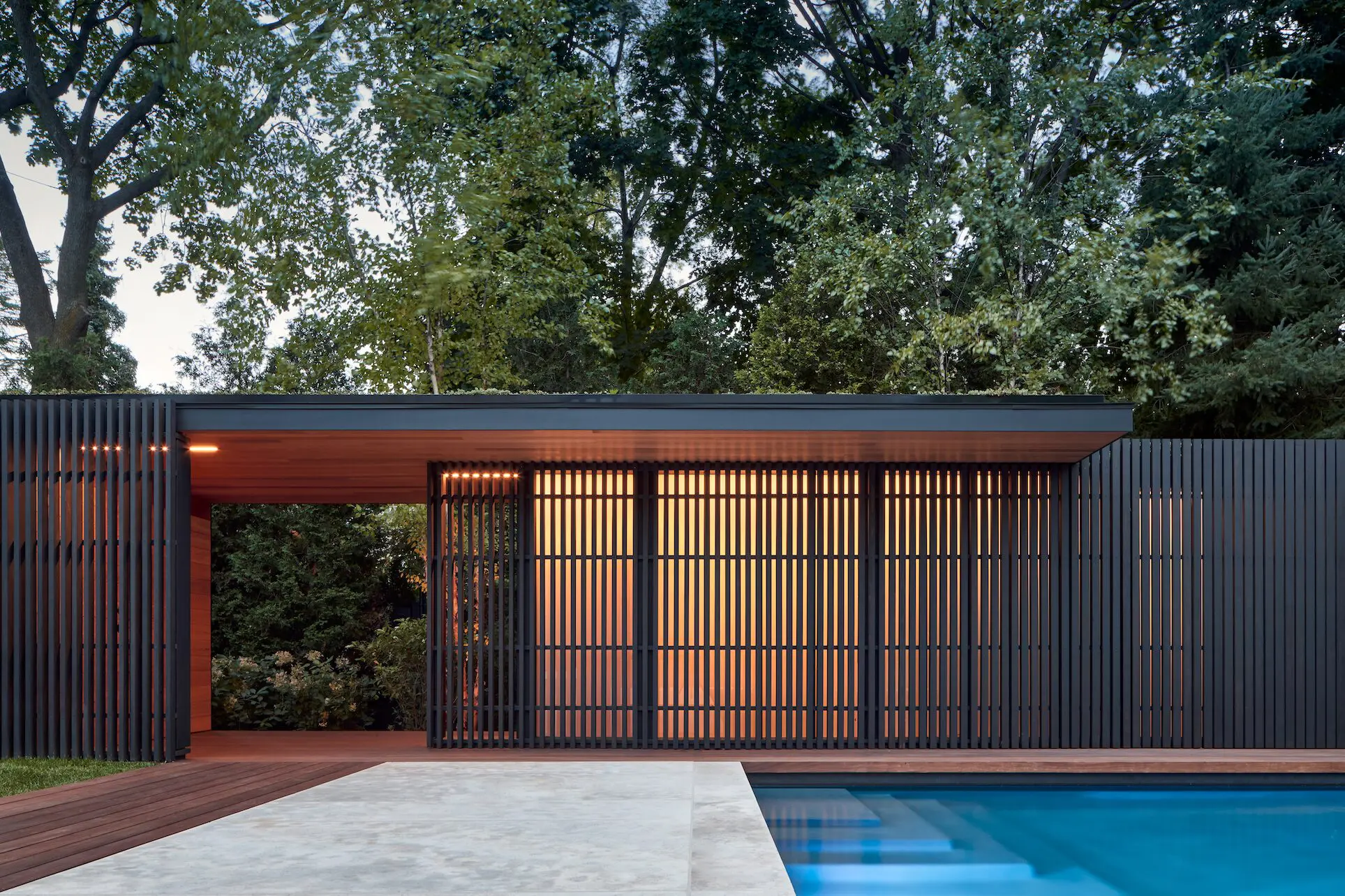 El punto focal del paisaje es un nuevo pabellón de 47 metros cuadrados que abarca casi todo el ancho del patio trasero y se coloca tan cerca de la línea trasera de la propiedad como se permite. Flotando sobre el nivel nativo en los muelles para mitigar su impacto en los árboles adyacentes, la forma lineal del pabellón está configurada para preservar la vegetación existente. Revestido de negro para contrastar con el follaje circundante mientras retrocede visualmente hacia el fondo, el pabellón funciona como una pantalla, creando la ilusión de un espacio ilimitado más allá. La elevación que da a la casa es un conjunto de listones de cedro verticales que pasan gradualmente de anchos y poco profundos en los extremos del edificio, que albergan el almacenamiento y la mecánica, a más estrechos, más profundos y más espaciados en su centro.
