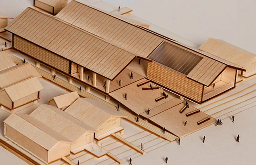 El proyecto, con un área construida de 894m2 y 4350 m2 de espacio público, es la suma de dos casas palafíticas tradicionales elevadas a 2.50m del nivel del terreno -teniendo como referencia 1.6 m como el nivel máximo histórico de inundación registrado para el río-, ligeramente desplazadas una al lado de la otra, marcando con este movimiento los accesos.