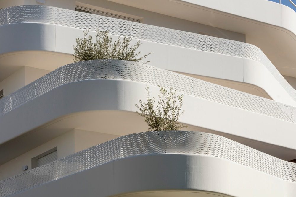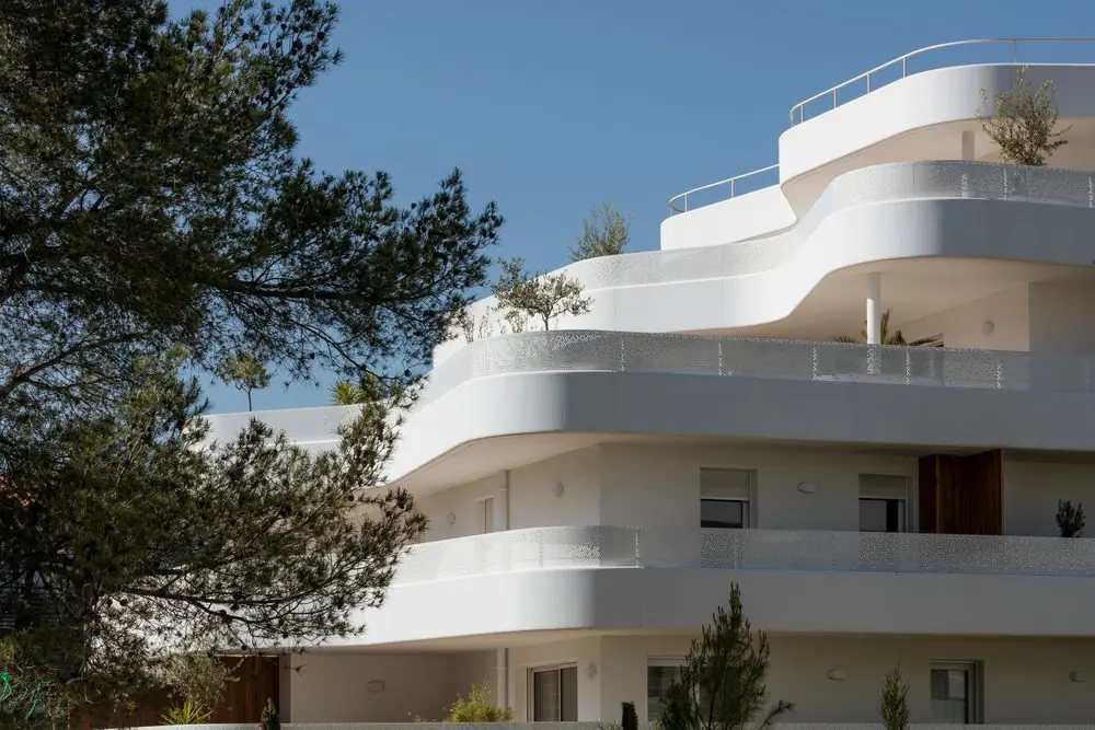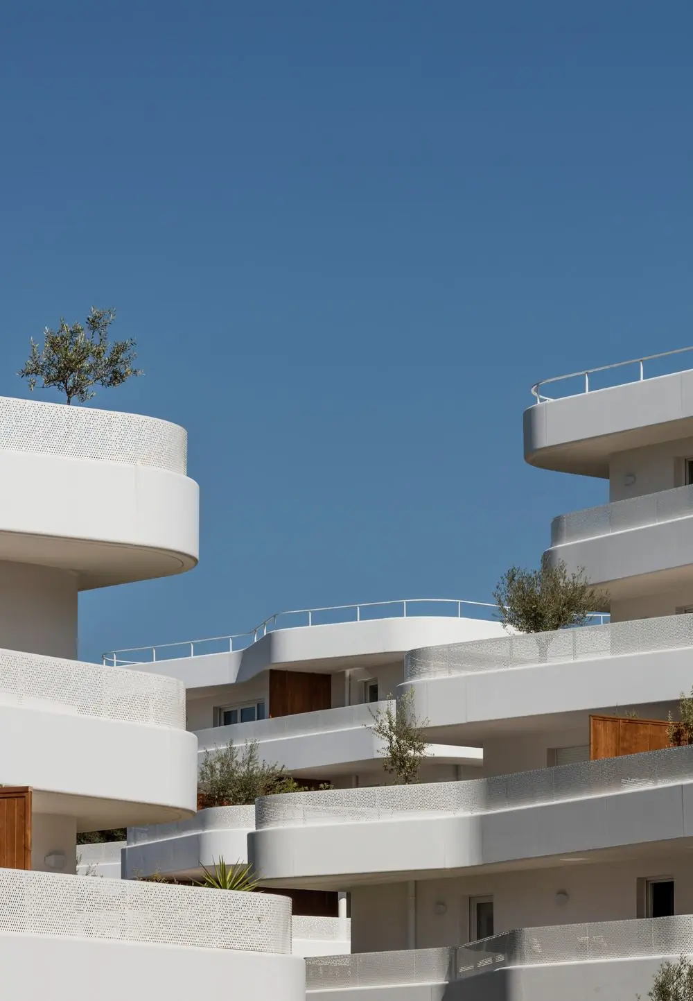 Las paredes del extremo con sus terrazas escalonadas crean niveles, haciéndose eco de la topografía montañosa cercana. Al norte, la línea del edificio se interrumpe, creando así una «entrada», que recuerda a las calas y revela un jardín paisajístico mediterráneo. El acceso a los pasillos de los dos edificios está ubicado en el centro de la parcela, ligeramente debajo de la carretera privada, lo que permite a los residentes disfrutar diariamente de la vegetación.