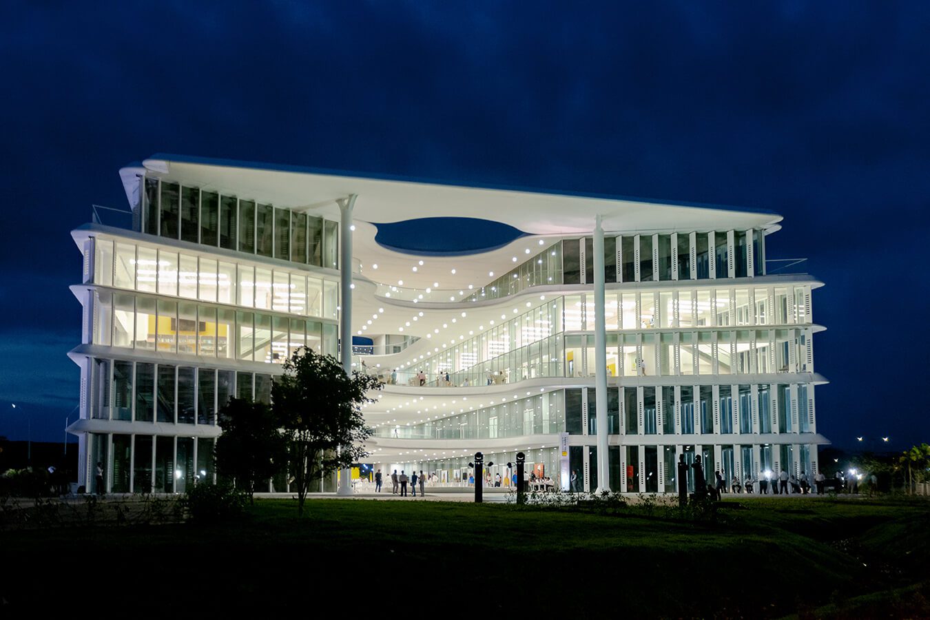 Al llegar la noche, cambia la percepción de la sede. Desde el exterior la luz se filtra por las aletas de hormigón de la fachada, mientras en el interior el blanco de la estructura la hace resplandecer. “La iluminación es muy importante porque la vida social también pasa afuera. Creamos una propuesta muy pareja para que todos los espacios puedan ser utilizados en cualquier momento. Es un edificio que se disfruta tanto al interior como al exterior, solo que en el último es fresco de manera natural”.El secreto está en los detalles