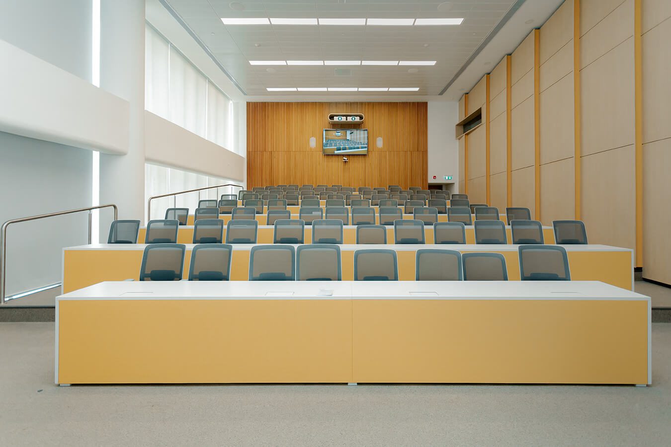 Luego de tomar los ascensores para dirigirse al tercer piso, donde está ubicada la sede de la Universidad de los Andes –el resto de los niveles están dedicados a facilidades de Serena del Mar–, nos encontramos con un ambiente cálido y amplio donde predomina el color amarillo. Sus diversos salones y salas de juntas comparten algo en común: el practicismo y la versatilidad, muchos de ellos pueden transformarse con el simple movimiento de unos paneles acústicos para aumentar o disminuir su capacidad –por ejemplo, al integrar cinco consiguen el área necesaria para eventos como exposiciones–. Igual pasa con los grandes ventanales, los cuales se oscurecen en distintos niveles mediante velos y blackouts. Sobresalen el Salón Magistral, con capacidad para 50 personas; el Hemiciclo, de forma escalonada, para una clase más interactiva y pensado para 30 estudiantes, y el Auditorio, también escalonado, pero con un aforo de 90. Estos tres espacios tienen su propia cabina de traducción simultánea.