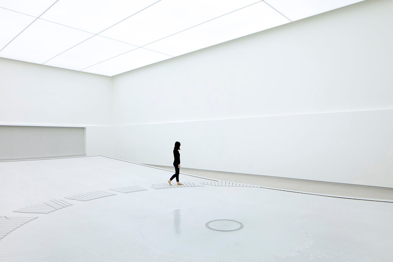 Dentro de la estructura de 35 m x 35 m, el arquitecto creó una gran “sala de agua”, una instalación multisensorial compuesta por 25.000 gotas que circulan por canales diseñados sobre una superficie inclinada. La interacción de los visitantes se basa en una serie de sensores de tacto, que alteran la cadencia de la caída de las gotas para generar ritmos y secuencias a medida que estas colisionan, se unen y se separan a través de los recorridos establecidos por Khan. Estos flujos individuales se convierten en un lago en el centro del espacio que crece y desaparece continuamente.
