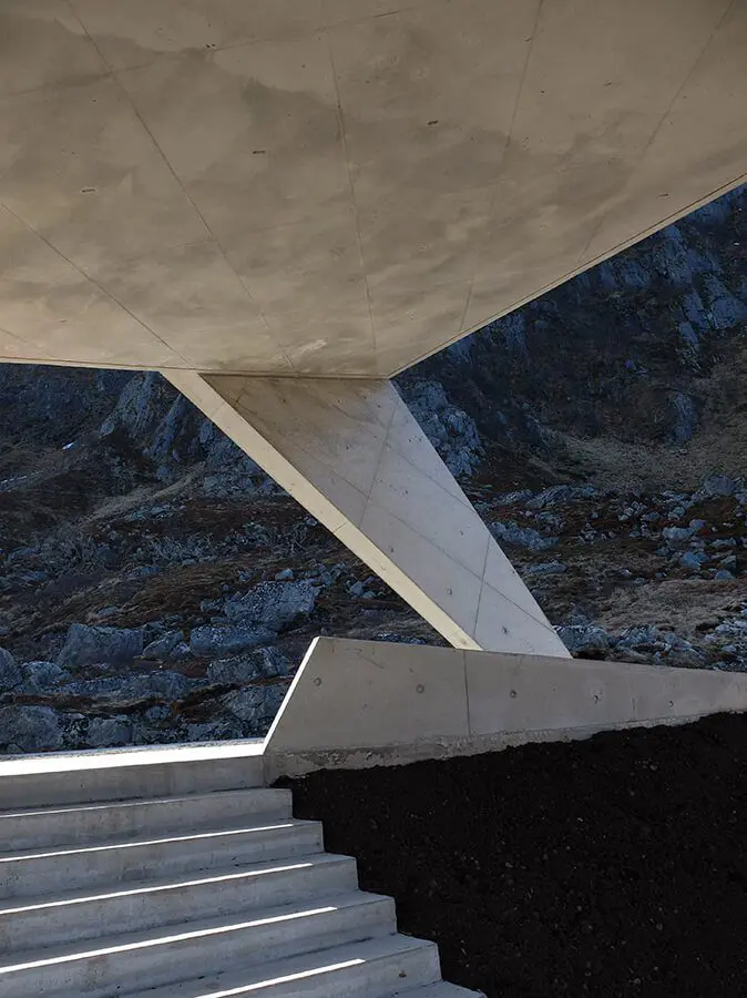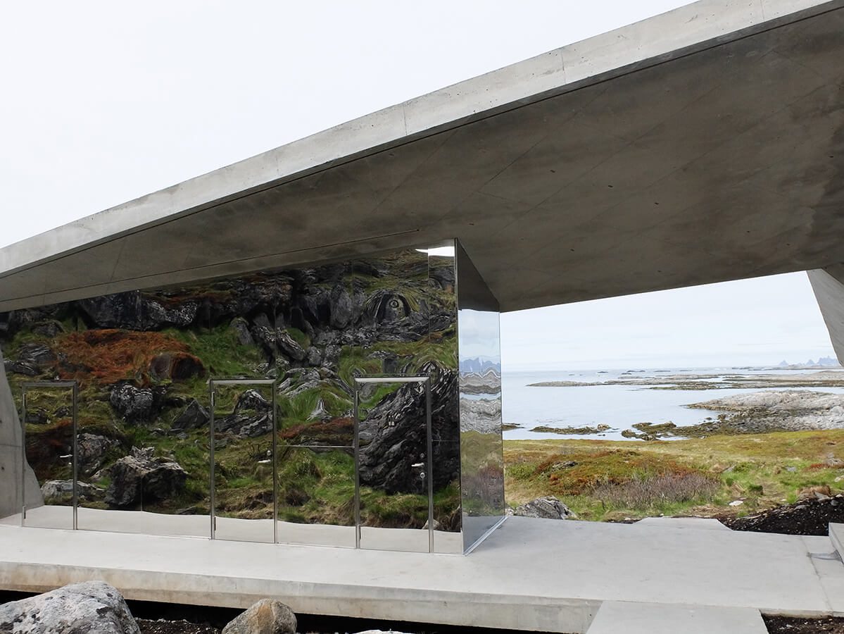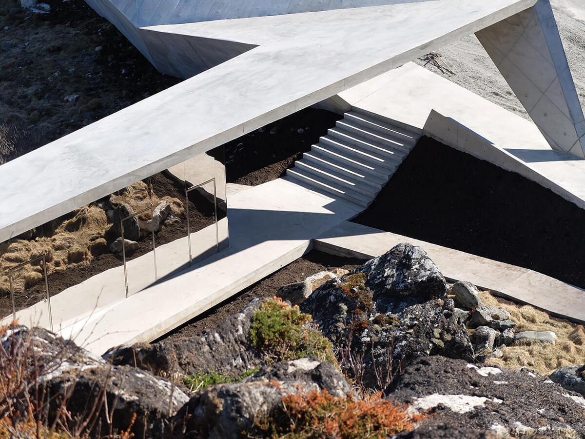 En el exterior, las ventanas de vidrio proyectan el imponente paisaje e integran el edificio con su entorno. A su vez, las fachadas de acero pulido resisten el embate del clima, en especial la corrosión del agua de mar, y los múltiples reflejos hacen que la estructura se mezcle con las rocas y el cielo, ofreciendo a los visitantes experiencias nuevas y cambiantes dependiendo del tiempo.