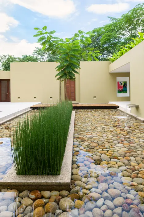“Este patio es principalmente de agua –explica el arquitecto–, lo que genera un impacto visual muy agradable, refrescante y natural, definitivo en la arquitectura en climas cálidos”. El agua y el trabajo de paisajismo, realizado por Ramiro Olarte, permitieron alcanzar el equilibrio entre la construcción y su entorno natural, al lograr que el jardín ingrese en la casa por todas partes, lo que refuerza la sensación de trópico.