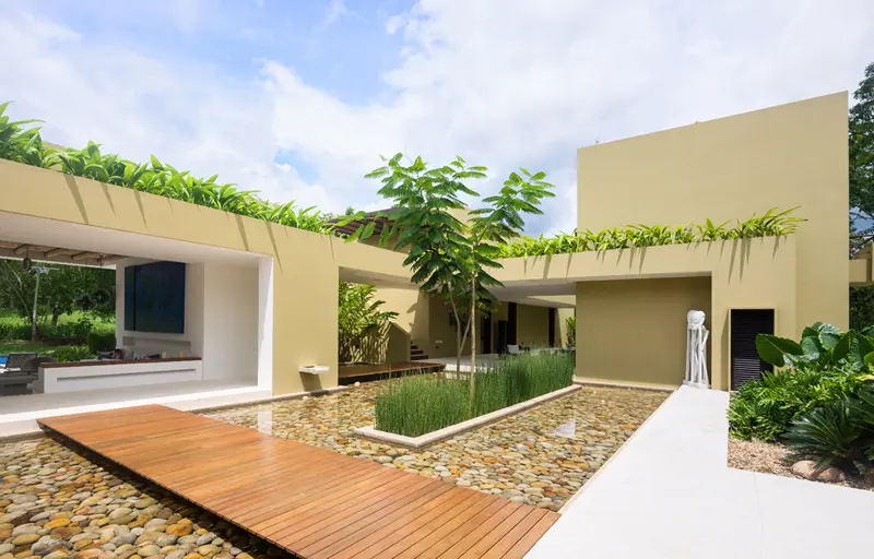 La disposición de los volúmenes configura los ambientes que rodean la casa y determina un patio central que, como lo explica Mauricio, “es recurrente en mis proyectos de viviendas campestres como elemento de organización y circulación que, además de generar un maravilloso espacio de acceso, sirve para ordenar alrededor de él las distintas áreas requeridas por los propietarios. Funciona muy bien como elemento de aislamiento entre las zonas sociales y las privadas y, adicionalmente, se convierte en una linda vista interior, lo que hace muy agradable recorrer el domicilio”.