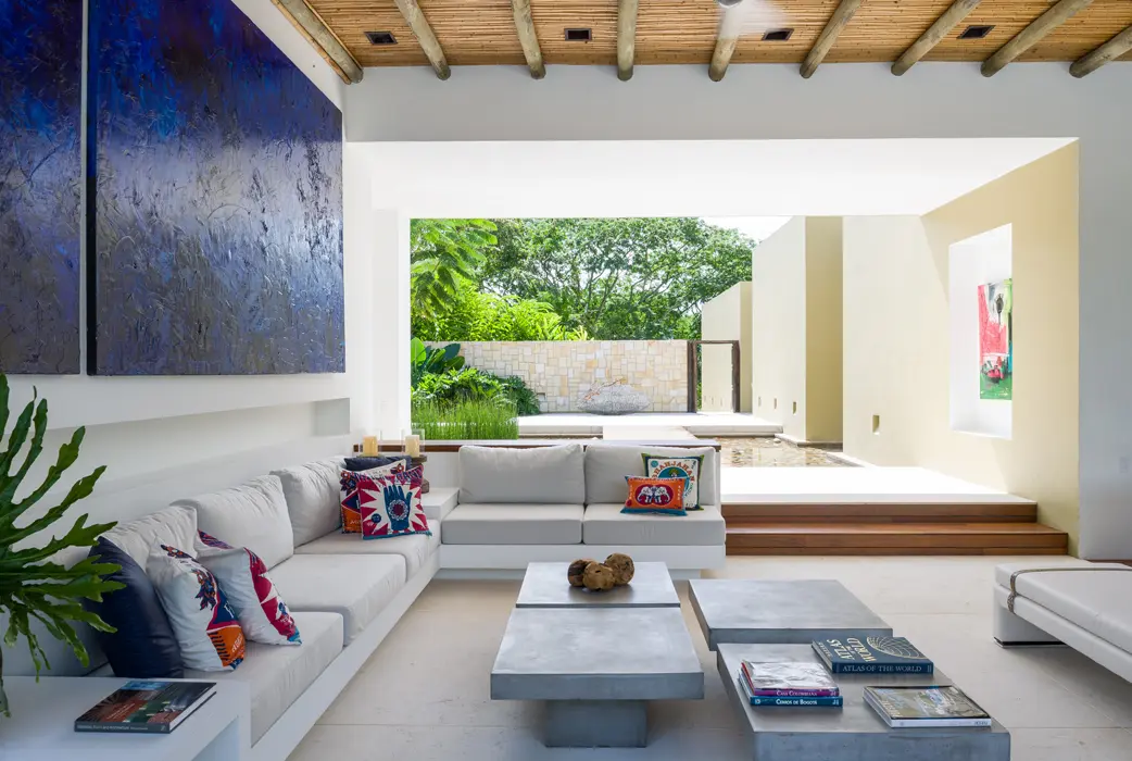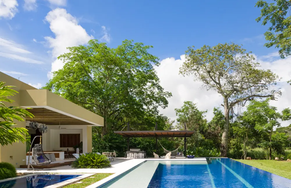 Entre la vegetación tropical, una arquitectura de sólida geometría marca los espacios de un lugar de descanso que busca tener la mayor limpieza visual.