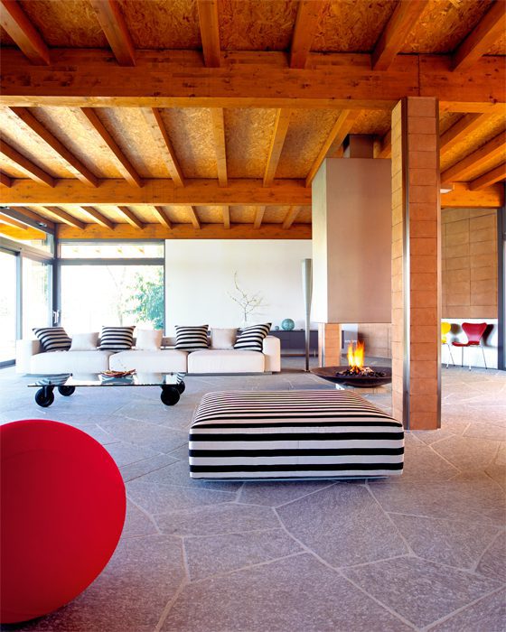 Fiel a la idea de usar materiales naturales, el arquitecto especificó grandes cantidades de madera dentro de la villa y en sus construcciones complementarias. Las puertas interiores se perciben como recortes en los muros, y grandes vigas de madera se extienden entre los apoyos de mampostería. Y tal como lo hacen los muros aparentemente interminables, las pérgolas y quiebrasoles de madera destacan la amplitud de la casa. La puerta de entrada consiste en un bastidor metálico con motorización eléctrica que soporta el mismo tipo de tablones de arcilla usados en las paredes, reiterando la continuidad de los materiales a lo largo de la obra.