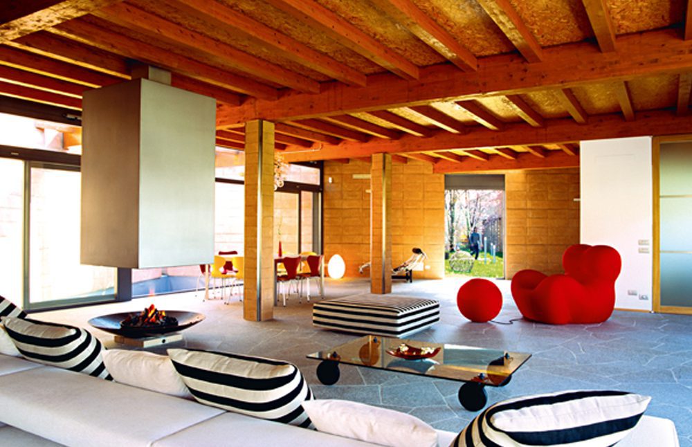 El distrito del alto Brianza se caracteriza por un paisaje más bien llano que no ofrece la posibilidad de construir en sitios expuestos.Este hecho llevó al arquitecto a escoger un tipo de construcción que se conectara con el suelo. Gracias a una arquitectura inteligente, los espacios abiertos en ocasiones se cubren y los internos se abren. Largos muros hacen la transición entre el interior y el exterior y sus remates abiertos sugieren una continuidad infinita.