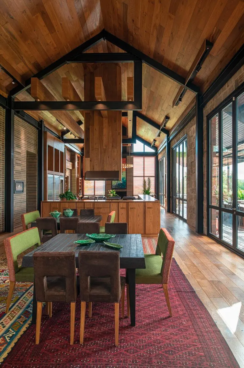 La cocina es el centro del área social. En torno a ella ubicaron el salón y el comedor, uno a cada lado. Este espacio se relaciona con los otros dos ambientes mediante una barra perimetral y, a la vez, se define como un lugar abierto bajo una serie de vigas de madera que controlan su altura, que alcanza los 6,50 metros hasta el caballete. La campana de extracción está oculta dentro de un bloque vertical, también de madera, como si fuera una escultura flotante.