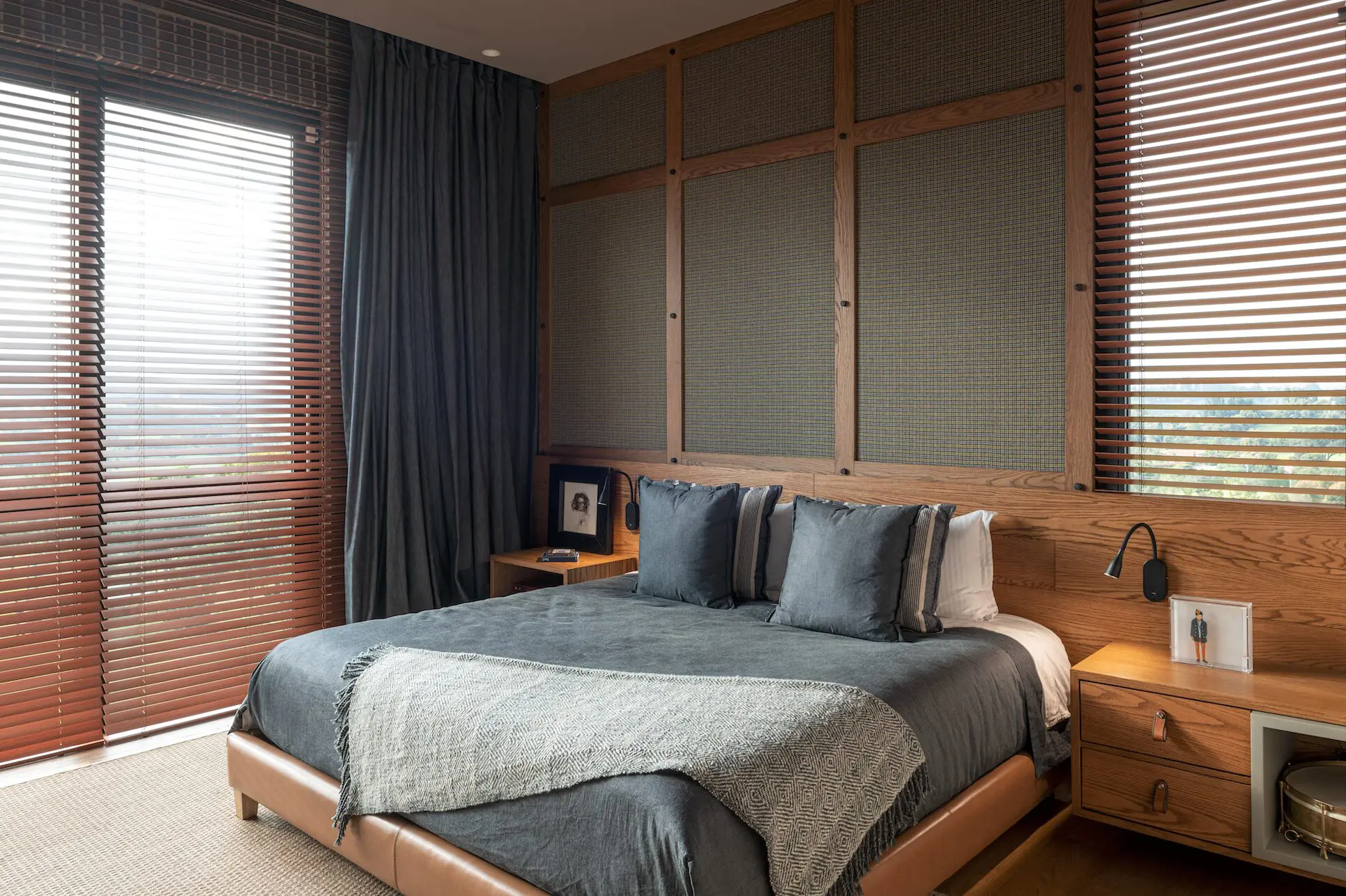 Las habitaciones están agrupadas en galería de tal forma que todas puedan disfrutar de la vista al paisaje. En dos niveles se disponen seis alcobas, cada una con baño y vestier privados. La escalera que conecta estas dos plantas destaca en la expresión formal de la casa al quedar contenida dentro del volumen de mayor altura, con persianas en fachada. Una terraza remata la zona privada del proyecto y hace las veces de cubierta habitable, desde la cual se puede apreciar nuevamente el panorama.