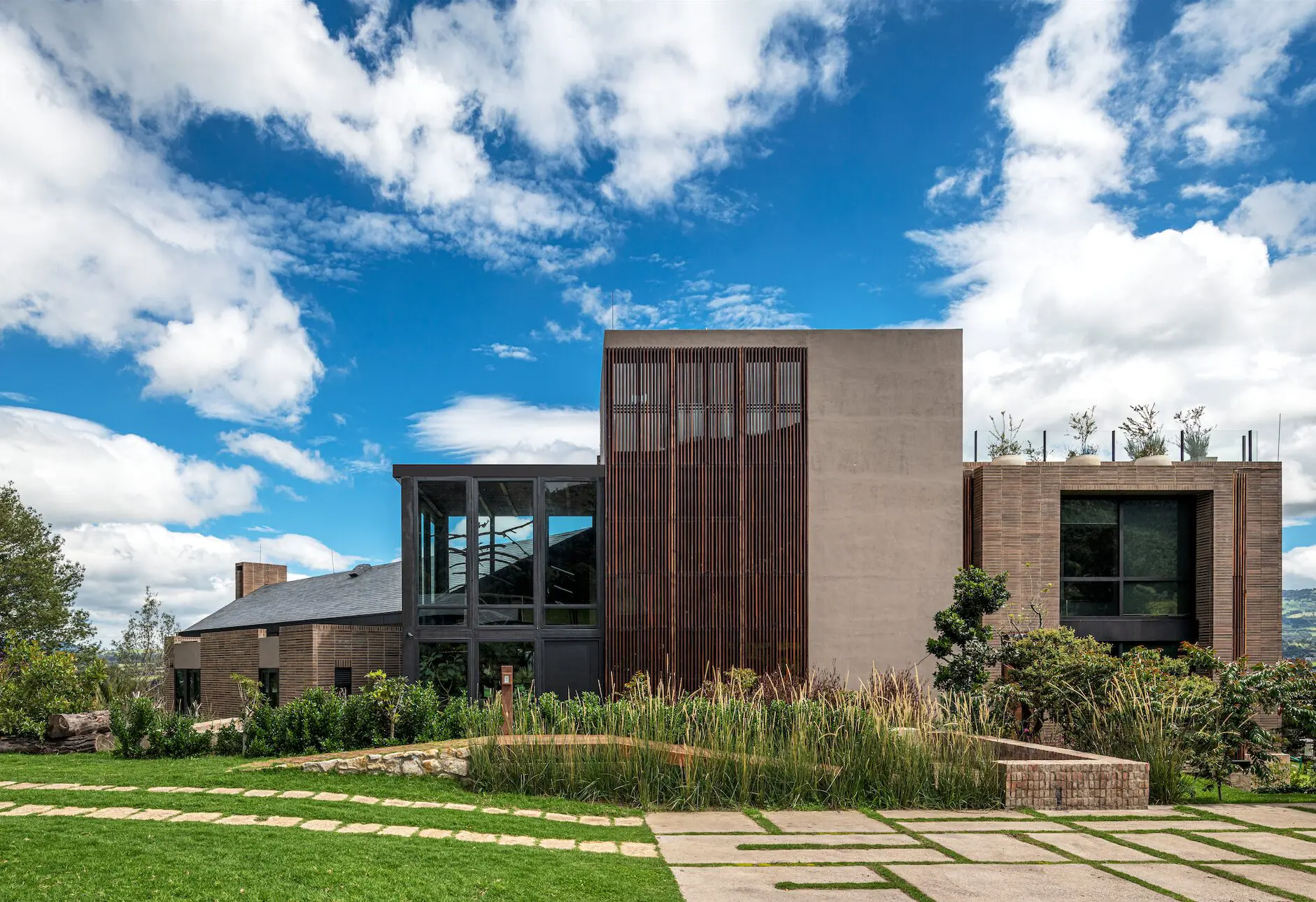 La arquitectura de la casa está definida por la unión de dos volúmenes. El primero, una nave con techo a dos aguas, contiene la zona social, mientras el segundo, un juego de cajas con diferentes alturas y cubiertas planas, alberga las habitaciones. La distribución interior de estos dos ámbitos, social y privado, se refuerza mediante un quiebre en la geometría que los separa espacialmente. Para las fachadas el arquitecto optó por utilizar materiales de tonos oscuros, con el propósito de integrarlas visualmente a la paleta cromática de los verdes de la sabana, pero también para recibir la mayor cantidad de radiación solar incidente y contribuir al confort térmico interior.