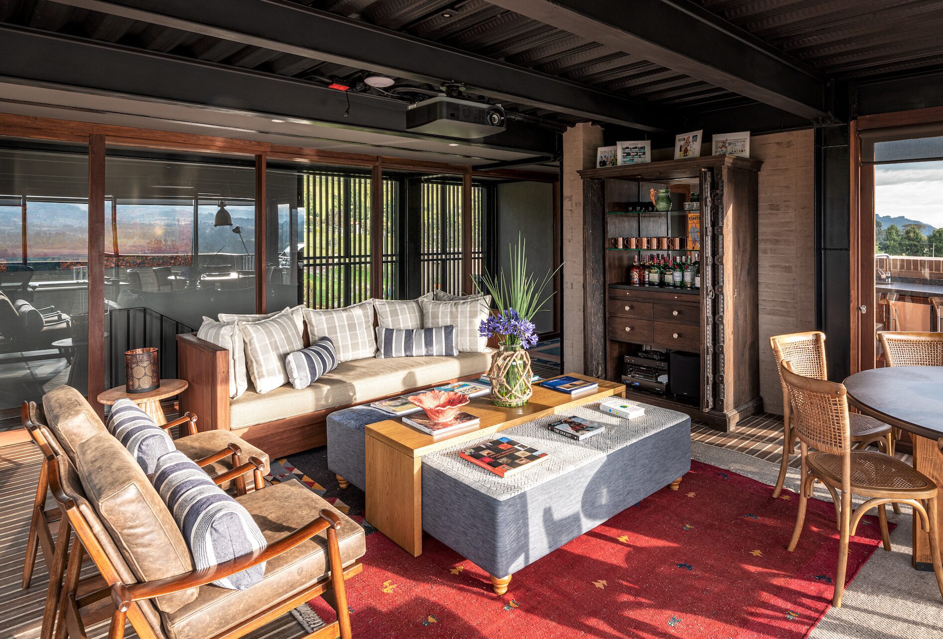 Enfrentada a la cocina aparece una terraza exterior, parcialmente protegida por una pérgola, en la que –al igual que en el interior– un bar actúa como articulador de las zonas libres amuebladas. La relación con la vegetación cercana y con las montañas a la distancia anima este lugar de encuentro bajo la sombra de su cubierta semitransparente. El adentro y el afuera se funden gracias a una espacialidad que se asemeja a la de las naves agrícolas de plantas libres con una altura importante, pero aquí la madera, el ladrillo y las estructuras metálicas dotan al proyecto de un carácter doméstico y suburbano.