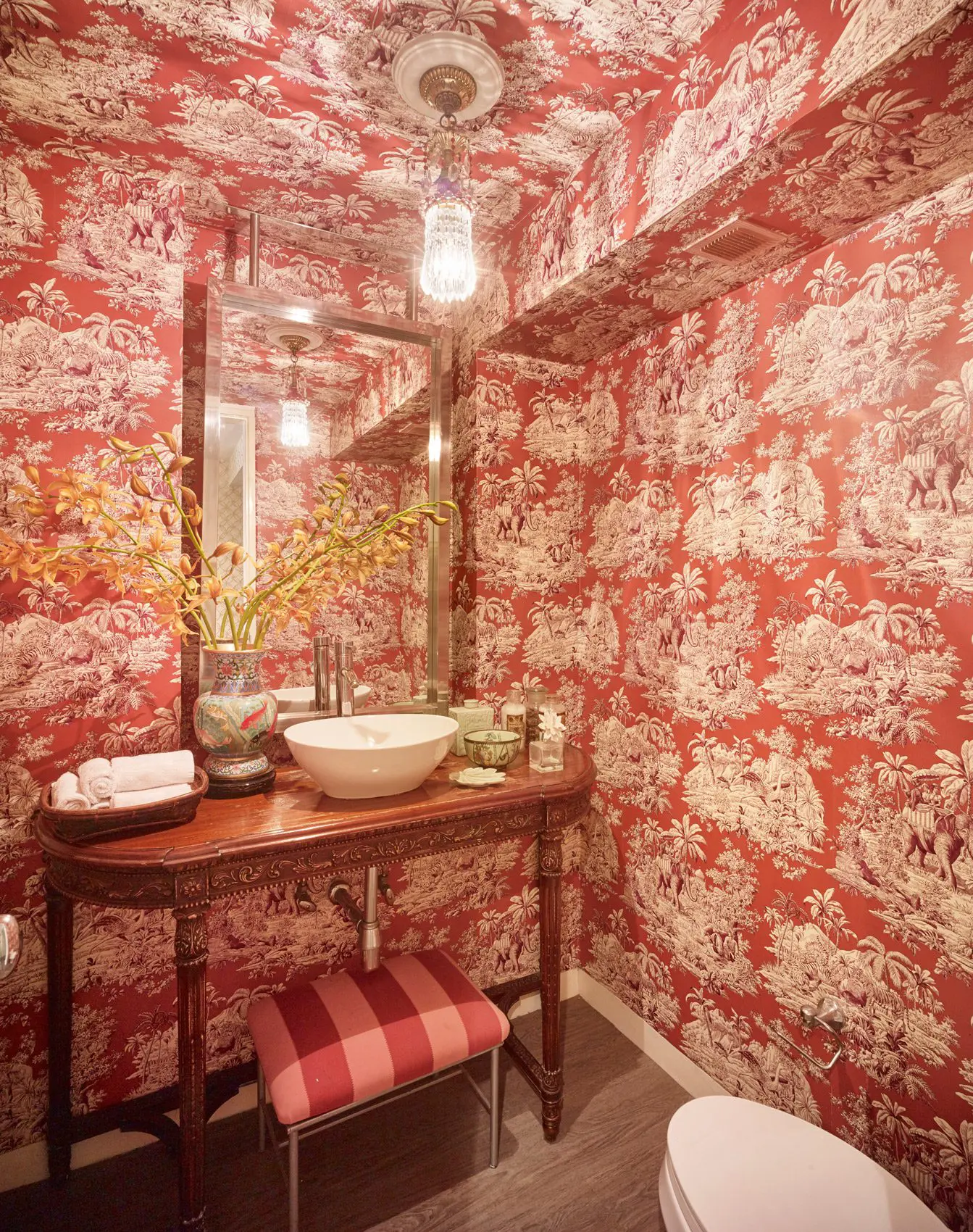 Este baño social, en una vivienda en Cali, sorprende al envolver al visitante con los colores y texturas de su papel de colgadura instalado, incluso, en el cielorraso. “Estoy convencida de que la estética y el entorno tienen un profundo efecto sobre el estado de ánimo y el comportamiento de la gente”, explica su propietaria. Para bajar un poco el tono, el mobiliario utilizado en esta área es de corte clásico, como se evidencia en la mesa tallada.