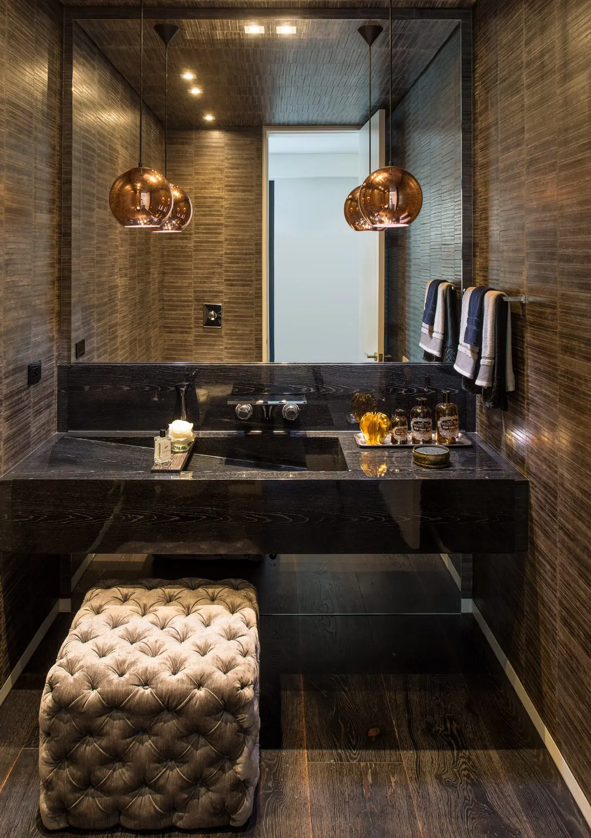 El uso de enchapes y maderas oscuras dan a este baño social una calidad espacial que se distancia de la estética tradicional utilizada en este ambiente. El puf capitoneado, algo también poco común en este espacio, está pensado para que invite a la permanencia, a disfrutar al máximo esta propuesta decorativa, realizada por la administradora de empresas y diseñadora Carolina Puerto. Las lámparas colgantes, con terminado cobre, son elementos elegidos más por su belleza que funcionalidad, ya que la iluminación necesaria está distribuida en el cielorraso.