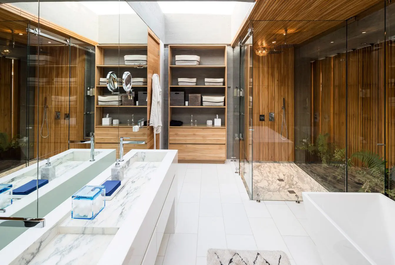 En el caso de los baños principales y de habitaciones, utilizados a diario y por periodos significativos, es importante procurar espacios amplios, fluidos y, de ser posible, con acceso a luz y ventilación natural. Cada vez más este ambiente se integra con los “vestieres” e, incluso, directamente con las alcobas para eliminar las barreras, facilitar su iluminación y generar una mejor integración entre las áreas.