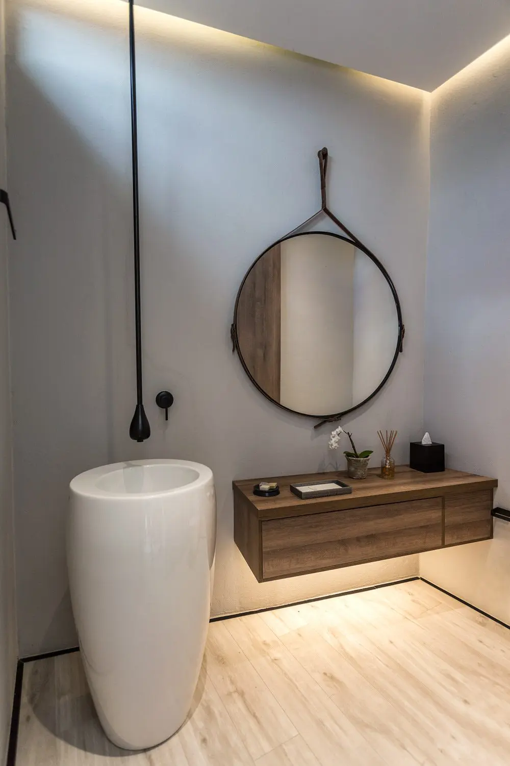 Al ser los animales la base de todo, la madera del robusto mesón flotante es la elección correcta por su naturalidad. A su vez, las formas circulares del lavamanos pedestal y del espejo suavizan la estética del lugar. Este no deja de ser un diseño sobrio, donde con pocos elementos logran una propuesta impactante. La luz, sin lugar a dudas, es la clave de todo.