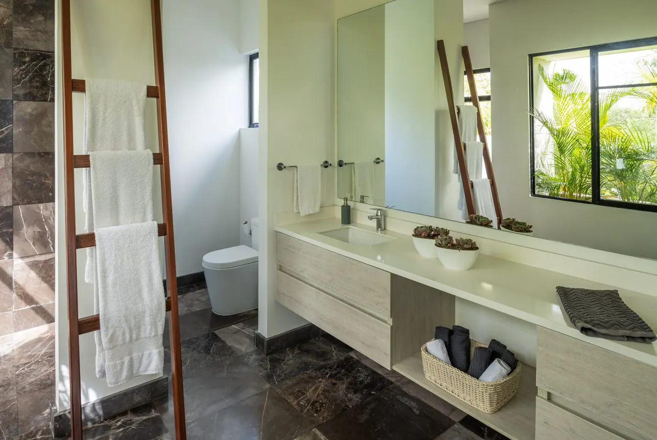 Alejandro Noreña está literalmente rodeada de naturaleza y esto se evidencia en el baño a través de generosos ventanales que la invitan al interior. Un detalle particular de su interiorismo es la escalera, objeto que sacan de su uso común para darle uno mucho más creativo: toallero. Lo anterior es un claro ejemplo de cómo la imaginación es la principal herramienta de cualquier propuesta.