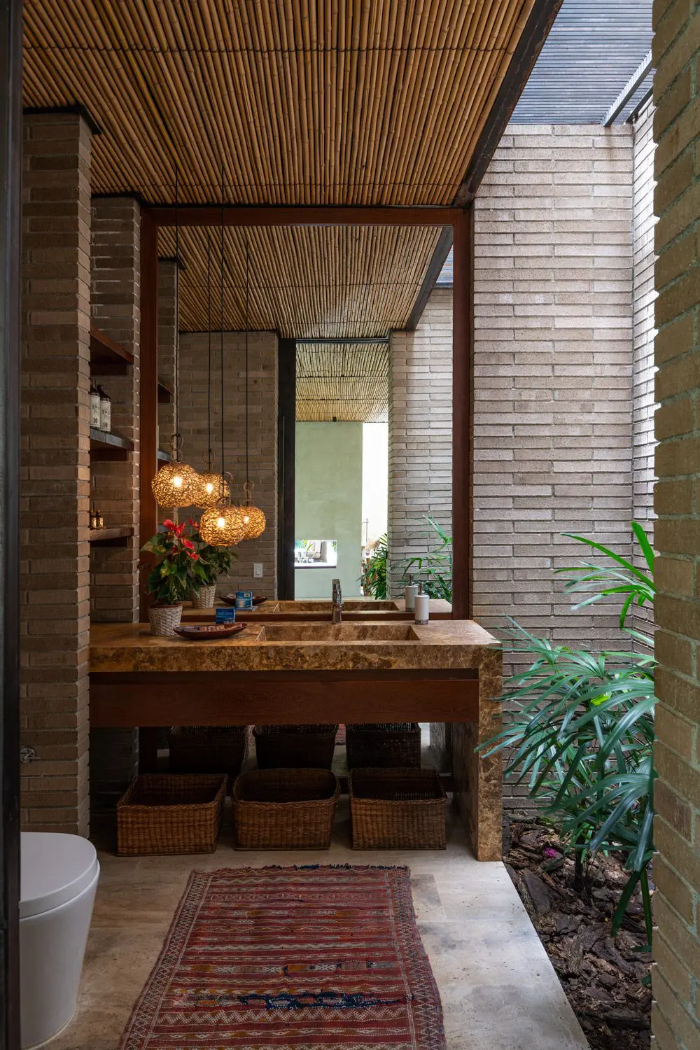 En las afueras de Pereira, muy cerca al Club Campestre, rodeada de montañas y agua se encuentra esta casa, diseñada por la arquitecta antioqueña Natalia Rodríguez. Un jardín interior que recibe los rayos solares de manera directa es el eje de este baño, donde el techo de bambú continúa con la estética inspirada en lo natural. Los tonos cafés y beige, tanto del ladrillo de los muros como