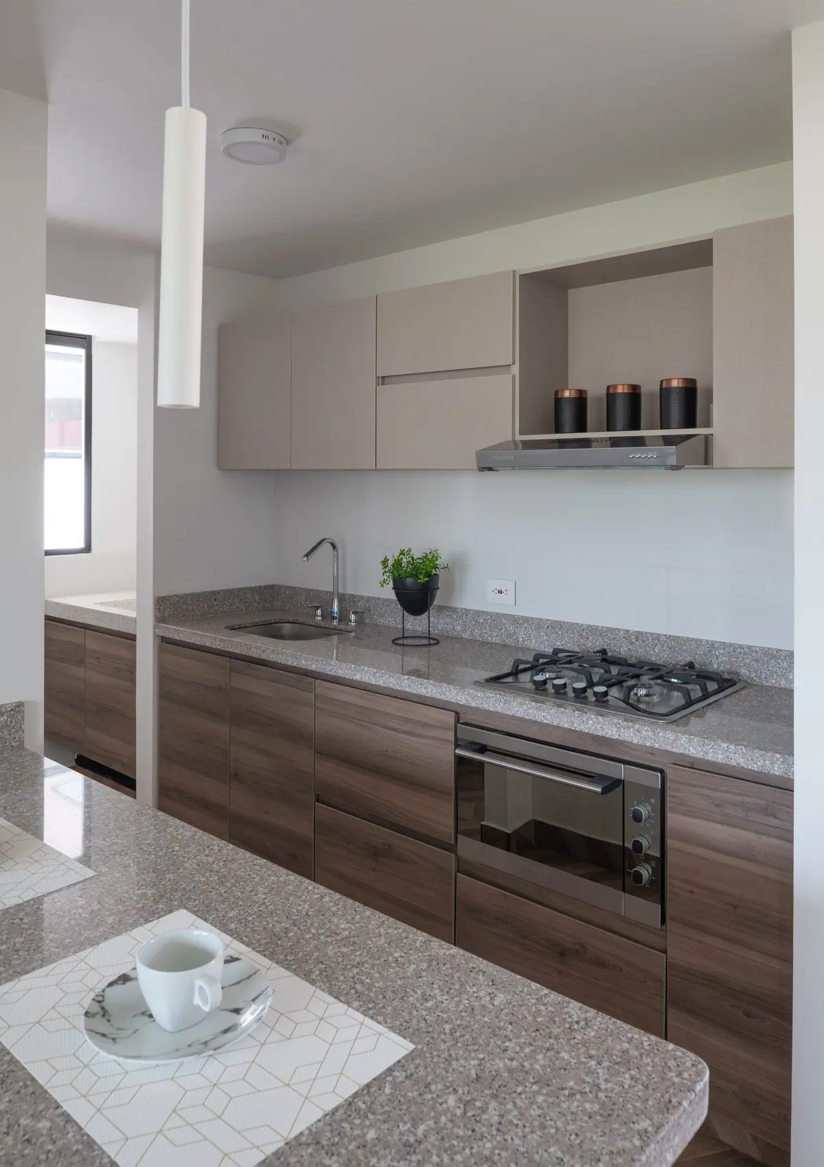 Tinguazul, proyecto residencial ubicado en Bogotá, compuesto por seis torres de 12 pisos y construido por Isarco, tiene en los acabados una de sus principales cartas de presentación. Para la carpintería arquitectónica utilizaron, como se percibe en los muebles superiores de la cocina, una melamina de la compañía Arauco. Seda Giorno tiene un acabado hilado con estructura natural.