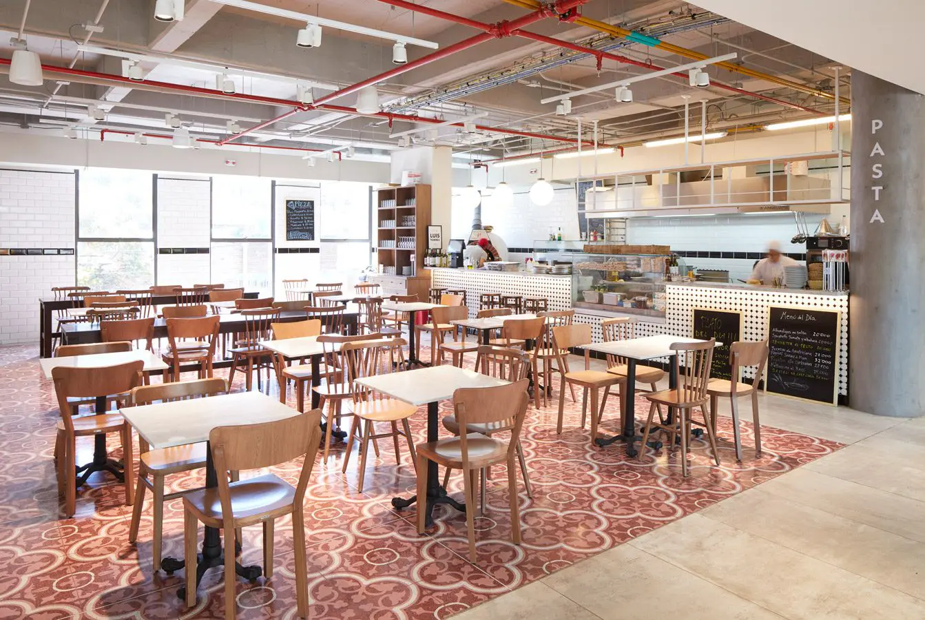 Los mosaicos de terrazo de la compañía antioqueña Roca logran una balanceada combinación entre el aspecto de un mosaico tradicional y las virtudes técnicas de una baldosa de terrazo pulida –elaborada con cemento y triturados de rocas como mármol y calizas–. Este producto, pensado para superficies de tráfico alto, como espacios institucionales o comerciales, permite un alto brillo con un mantenimiento sencillo. Acorde con las tendencias de 2019, su fabricación artesanal ofrece múltiples diseños y combinaciones de colores, que posibilitan concebir espacios personalizados, como se logra en este sector del Boho Food Market de Bogotá.