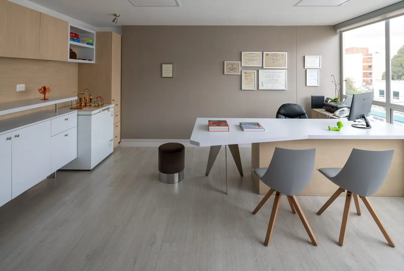 El otro punto de este concepto es el área de consulta, mucho más formal y donde el médico permanece la mayor parte del tiempo. Con una paleta de colores entre blanco y nuez, permite que tanto el niño como su acompañante estén cómodos; aquí la iluminación y la luz natural tienen un rol definitivo. Los materiales seleccionados para este proyecto debían ser de fácil mantenimiento, por ello escogieron fórmica en varias referencias para las superficies y los pisos vinílicos Acquafloor, estos dos de la firma Lamitech, y prannas (telas vinílicas) para los tapizados.