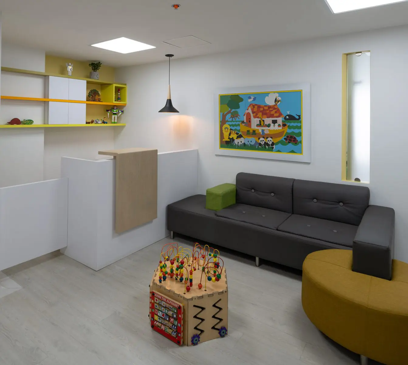 El diseño de este consultorio pediátrico en Bogotá, realizado y ejecutado por los arquitectos Marcelino Pérez –de Pasto– y René Corredor –de Bogotá–, se define en dos áreas. La primera, que comprende la recepción y zona de espera, presenta colores y materiales que transforman el lugar en un ambiente lúdico, para que los más pequeños vivan un momento agradable –incluso tiene un espacio con juguetes.