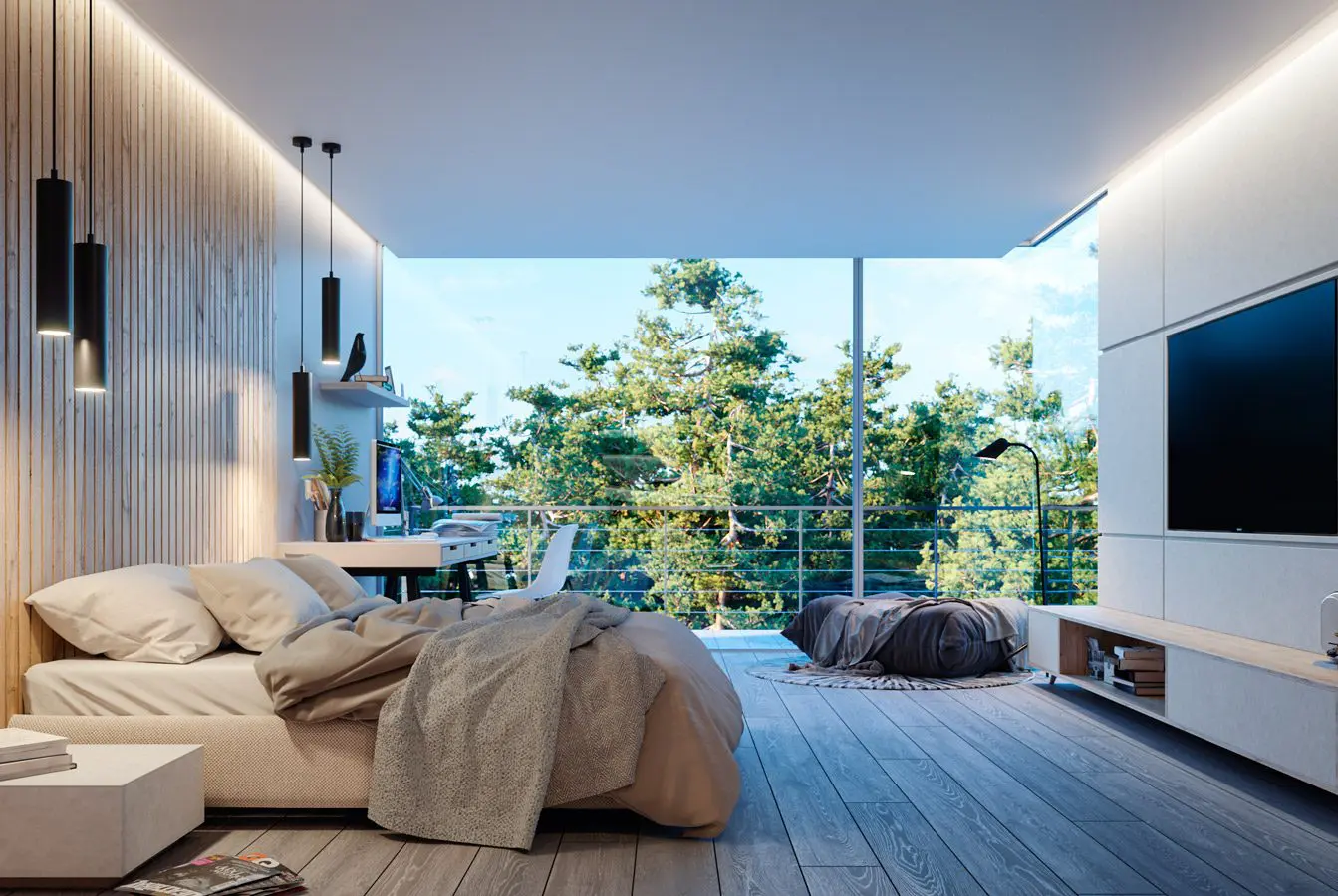La alta resistencia a la abrasión, característica de los pisos laminados, los hace ideales para ambientes residenciales o comerciales. Además, son tableros de fibras de alta densidad –HDF, High Density Fibreboard, por sus siglas en inglés– con una base de resina que da mayor resistencia a la humedad relativa. En este ambiente de dormitorio se ve cómo el producto recrea las vetas de la madera para otorgarle un aspecto más natural, de refugio, perfecto para la privilegiada vista sobre los árboles.