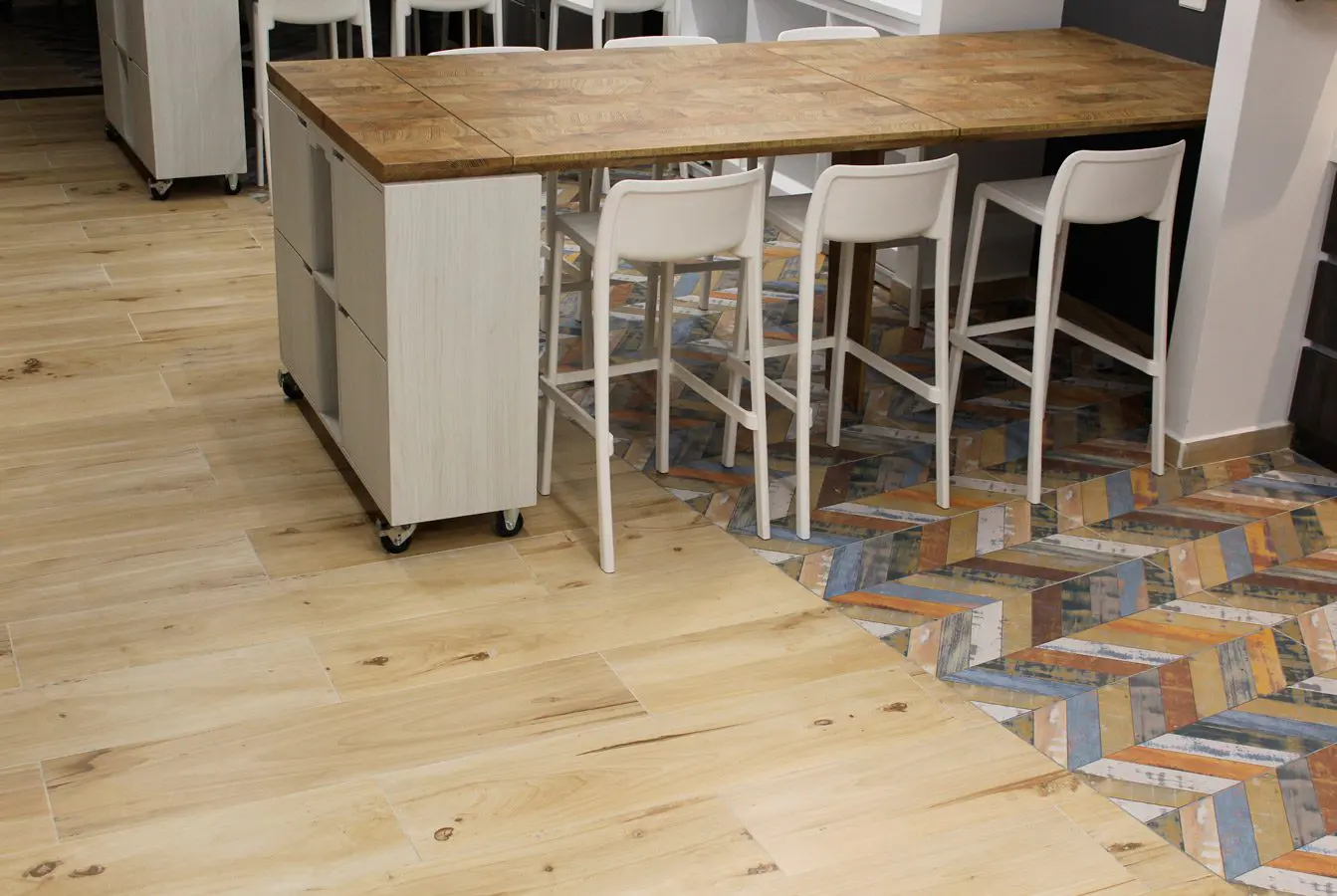 Para darle movimiento al espacio optaron por un porcelanato de múltiples colores en acabado envejecido e instalado en espina de pescado, y para bajar un poco el tono y no sobrecargar el ambiente, utilizaron –en otro segmento del piso– un producto que imita con gran realismo la madera en tonos claros –incluso algunas piezas muestran sus nudos.