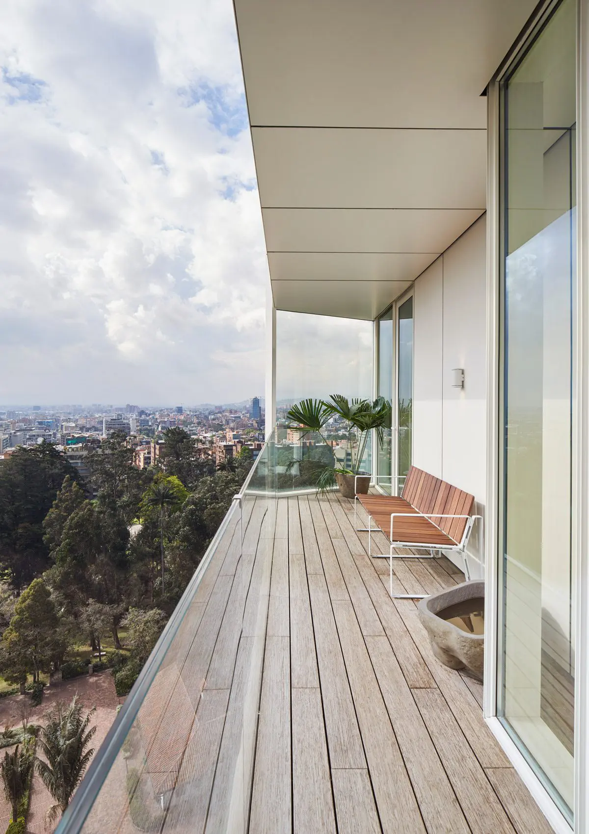 Las terrazas del proyecto Vitrum, edificio diseñado en Bogotá por el arquitecto estadounidense Richard Meier –premio Pritzker en 1984–, cuentan con tarimas de la firma Moso, distribuida en Colombia por Hunter Douglas. Este piso, compuesto por tiras de bambú comprimidas y tratadas térmicamente, es idóneo para aplicaciones exteriores e, incluso, puede ser utilizado cerca de una piscina.